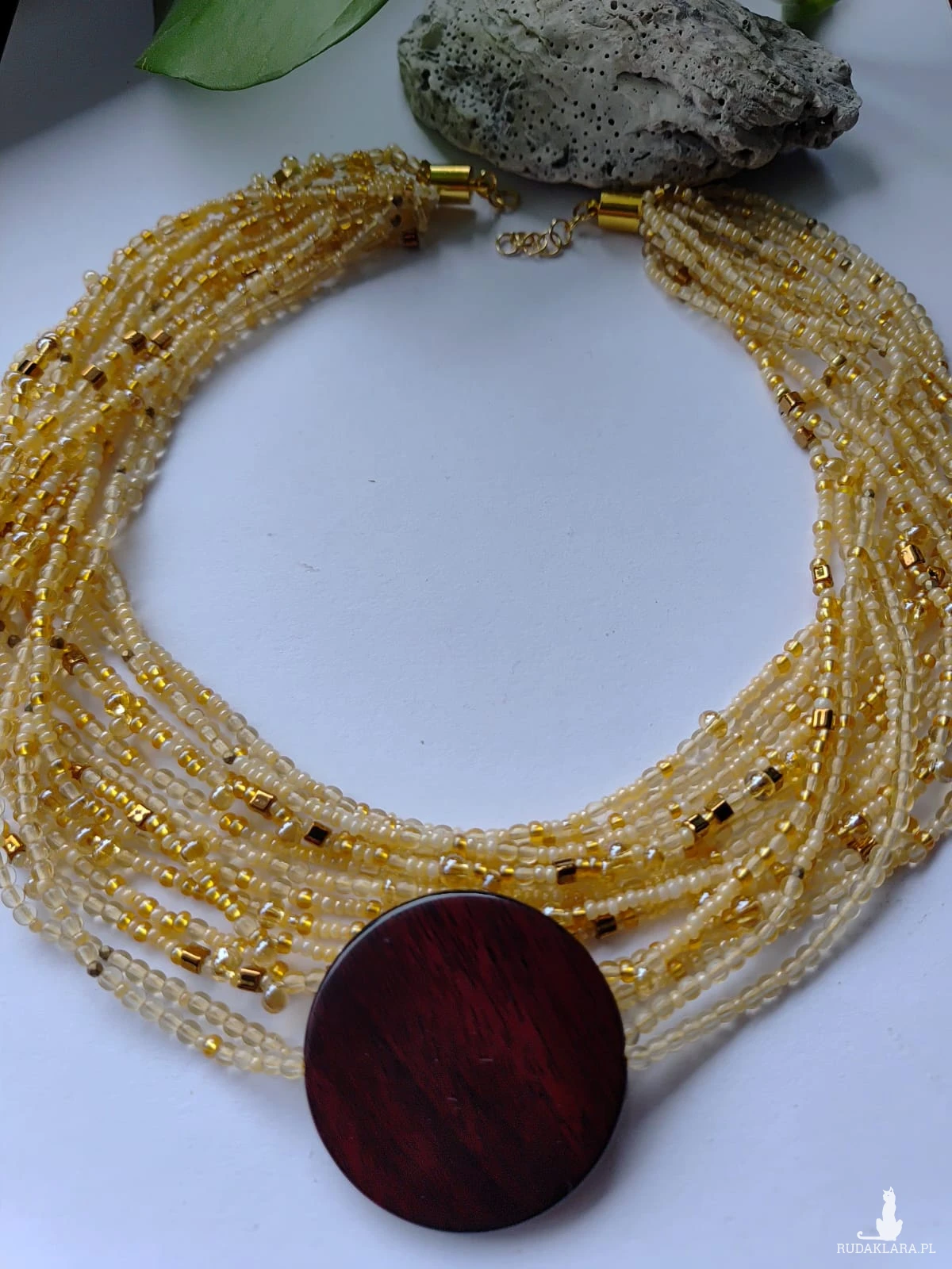 Naszyjnik z koralikow drobnych 2 -4 mm, wplecione kropelki w kolorze miodowym. Czternaście sznurków ze zlotymi kosteczkami i drobnymi kuleczkami hematytu. Ozdobą jest dysk imitujący krążek drewna. Pieknie się prezentuje na dekolcie. Naszyjnik jest krótki. Końcówki metalowe, zapięcie ze stali nierdzewnej. Objętość 44 cm
