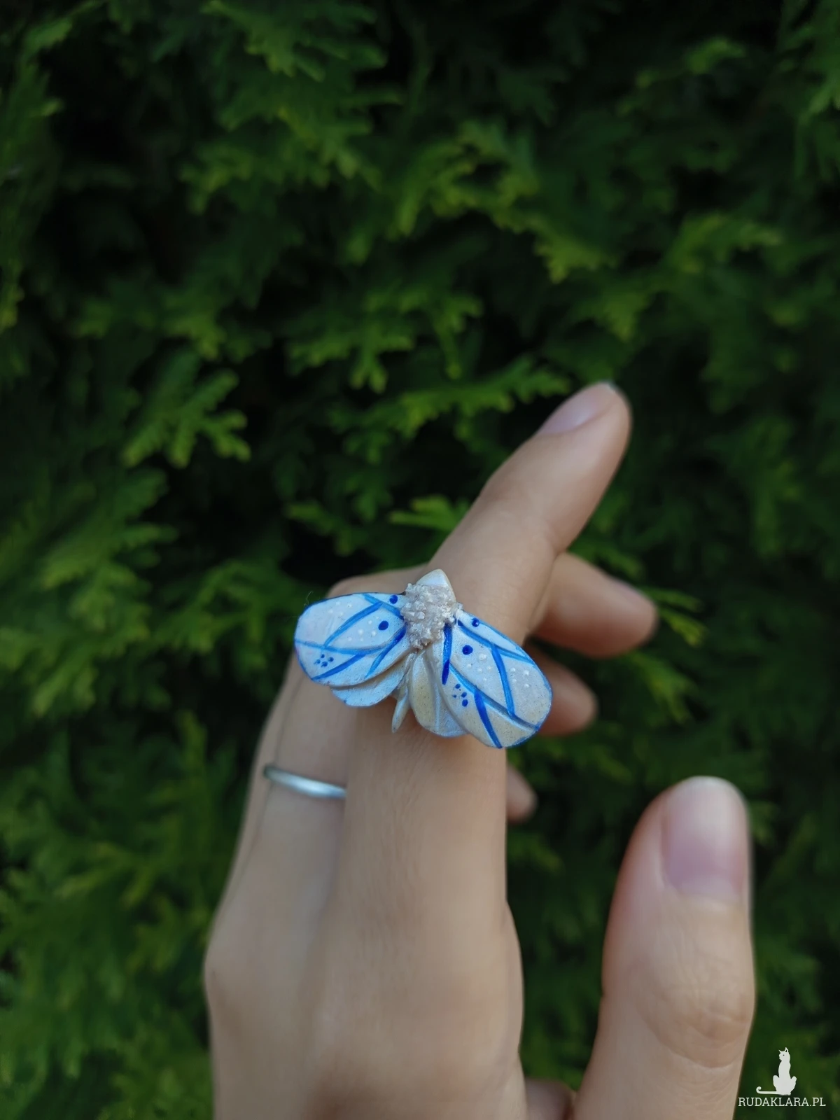 ręcznie rzeźbione pierścionki z kolorowymi ćmami osadzone na mosiężnym pierścieniu