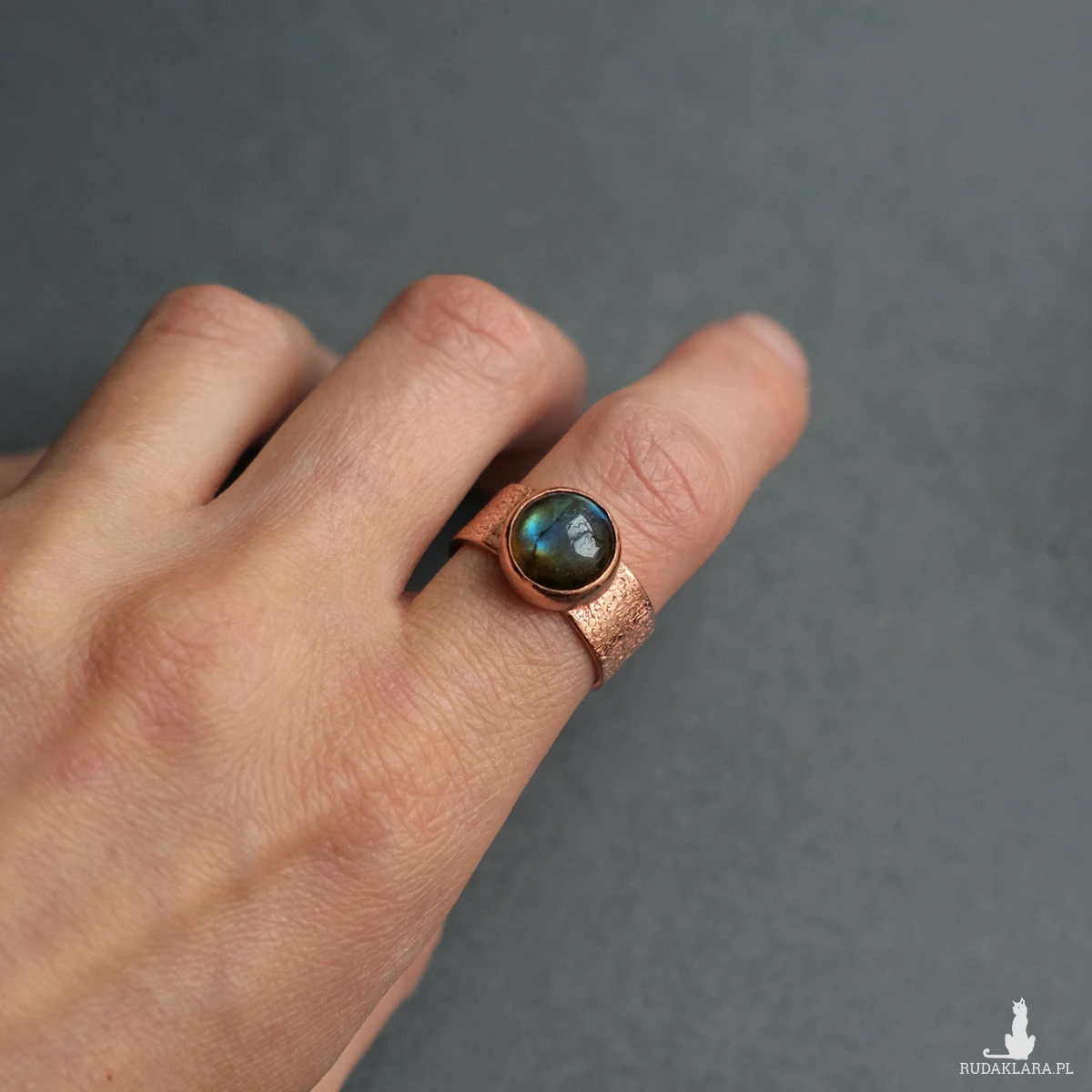 Pierścionek na szerokiej obrączce mieści w sobie labradoryt o pięknej błękitnej iryzacji. Pierścionek został wykonany ręcznie z czystej miedzi, średnica kamienia 10 mm.
