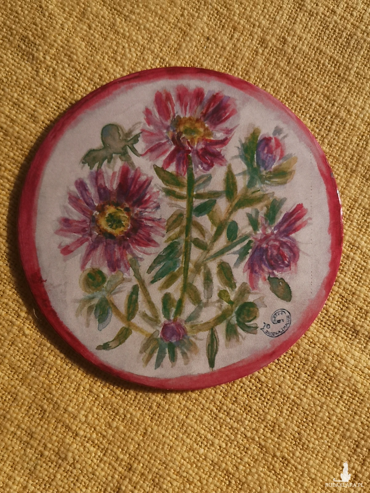 Okrągła podkładka pod kubek przedstawiająca astry. Średnica 9, 7 cm. Wydruk akwareli laminowany, na korku.