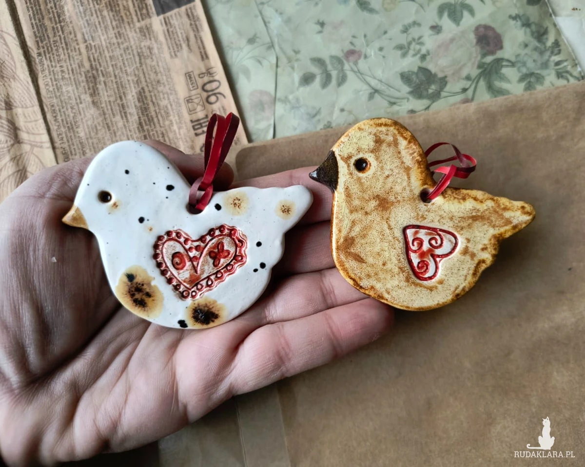 Zestaw złożony z 2 ptasząt do powieszenia na rarfii. Wykonany z gliny szamotowej, wypalony na biskwit, a następnie szkliwiony w temperaturze 1260 stopni C, o wymiarach ok 4,5 cm x 7 cm. Układ plamek może nieznacznie różnić się od tego na zdjęciu. Idealnie sprawdzą się jako prezent okolicznościowy lub ozdoba domu.