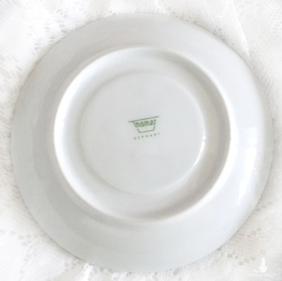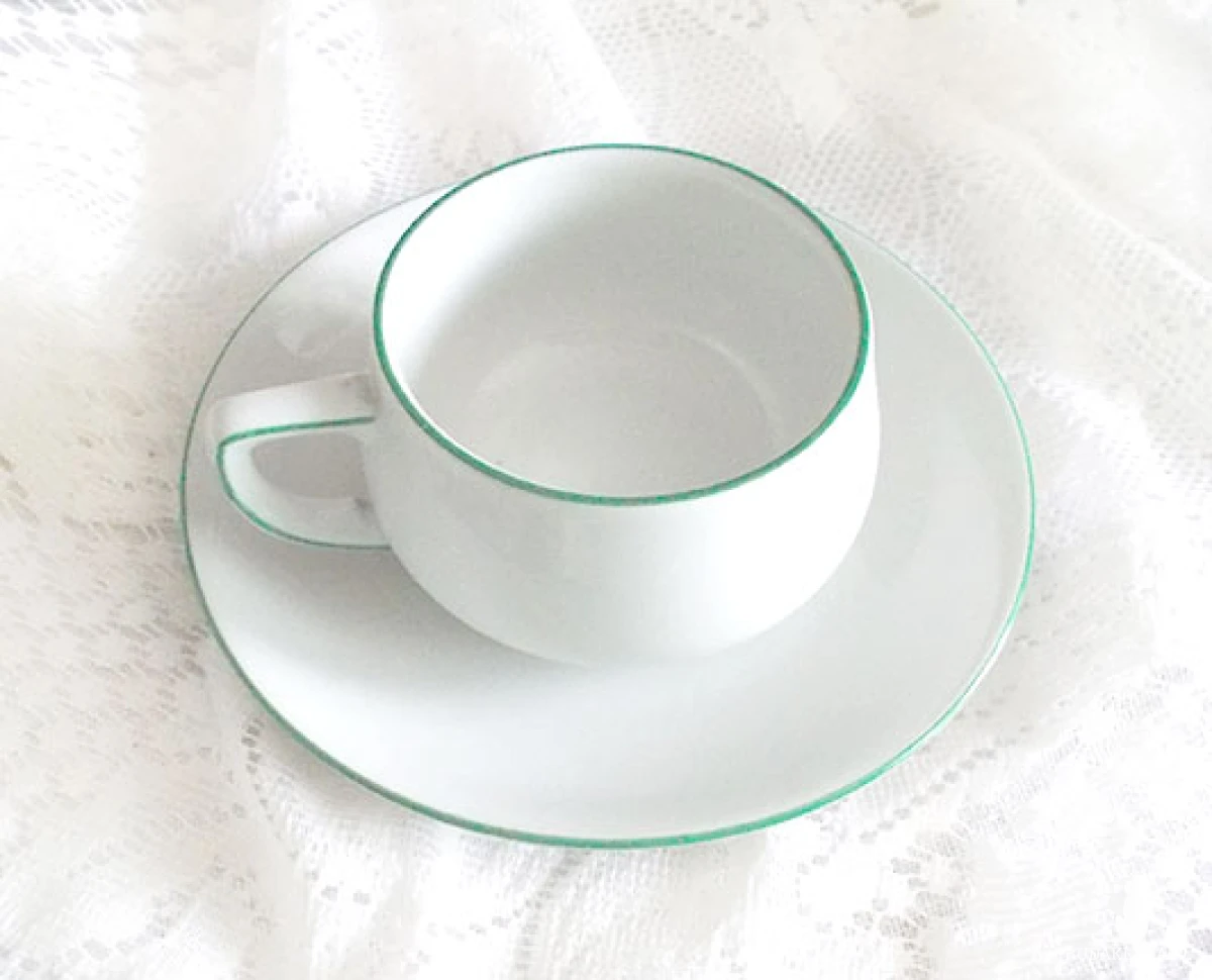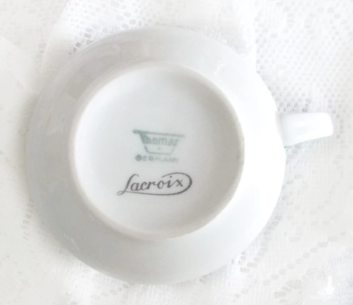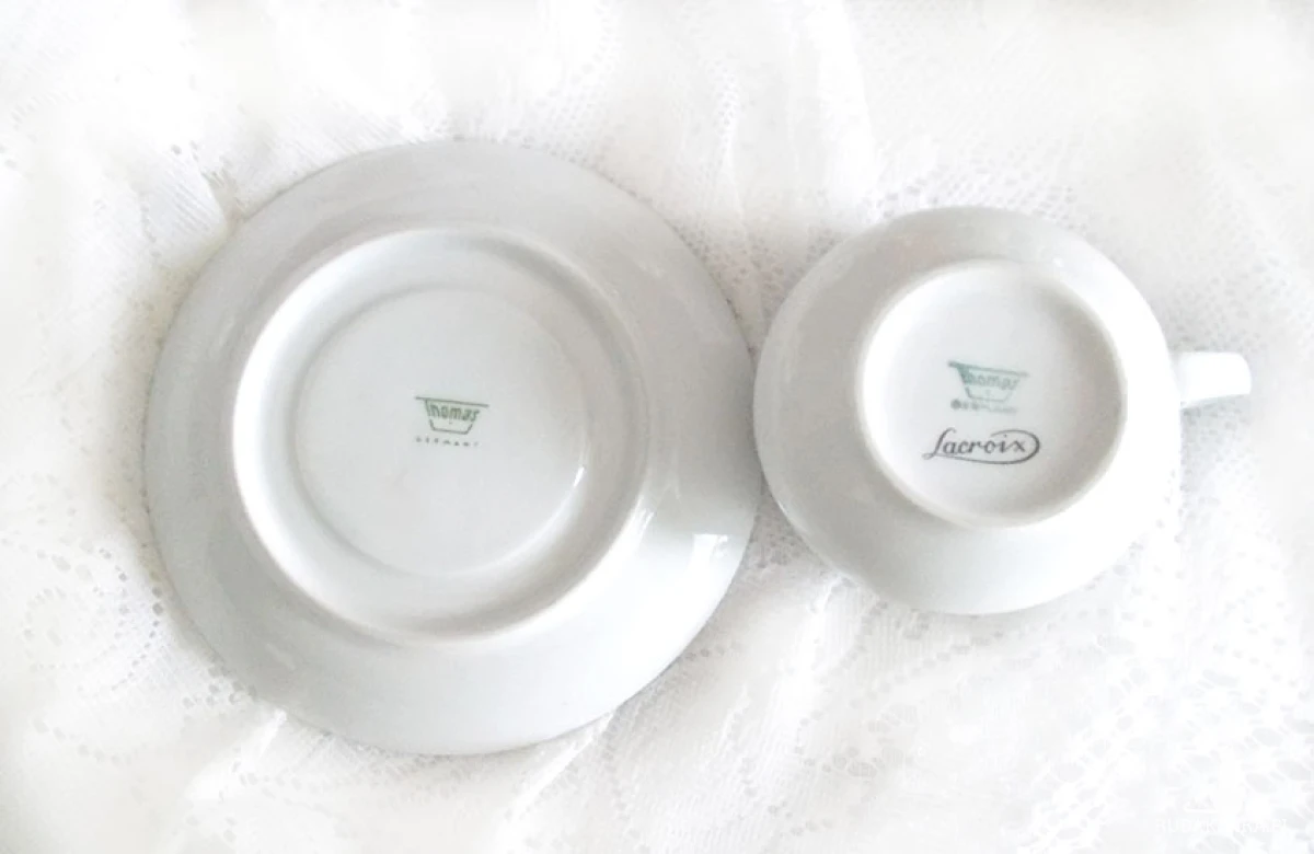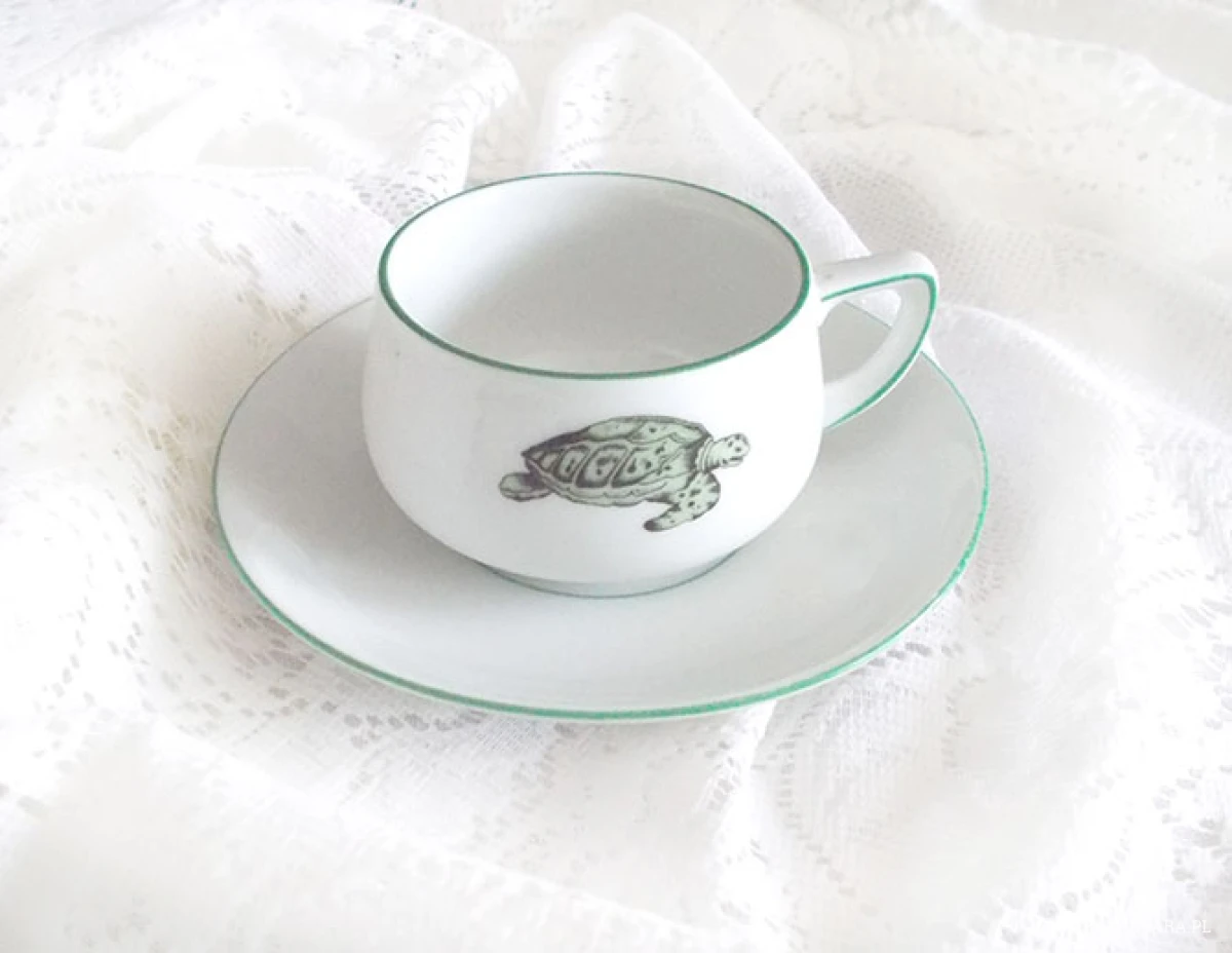 Przedmiot vintage. Lata 60/70 XX w. Oryginalna filiżanka ze spodeczkiem, stan bdb. Producent "Thomas Lacroix Germany". Wysokość filiżanki 4,5 cm, średnica 6 cm., szerokość z uchem 8,5 cm. Spodek średnica 12,5, wysokość 2 cm. Filiżanka jest z grafiką żółwia morskiego i zielonym paskiem dookoła, spodek jest gładki i także ozdobiony zielonym paskiem wokół.
