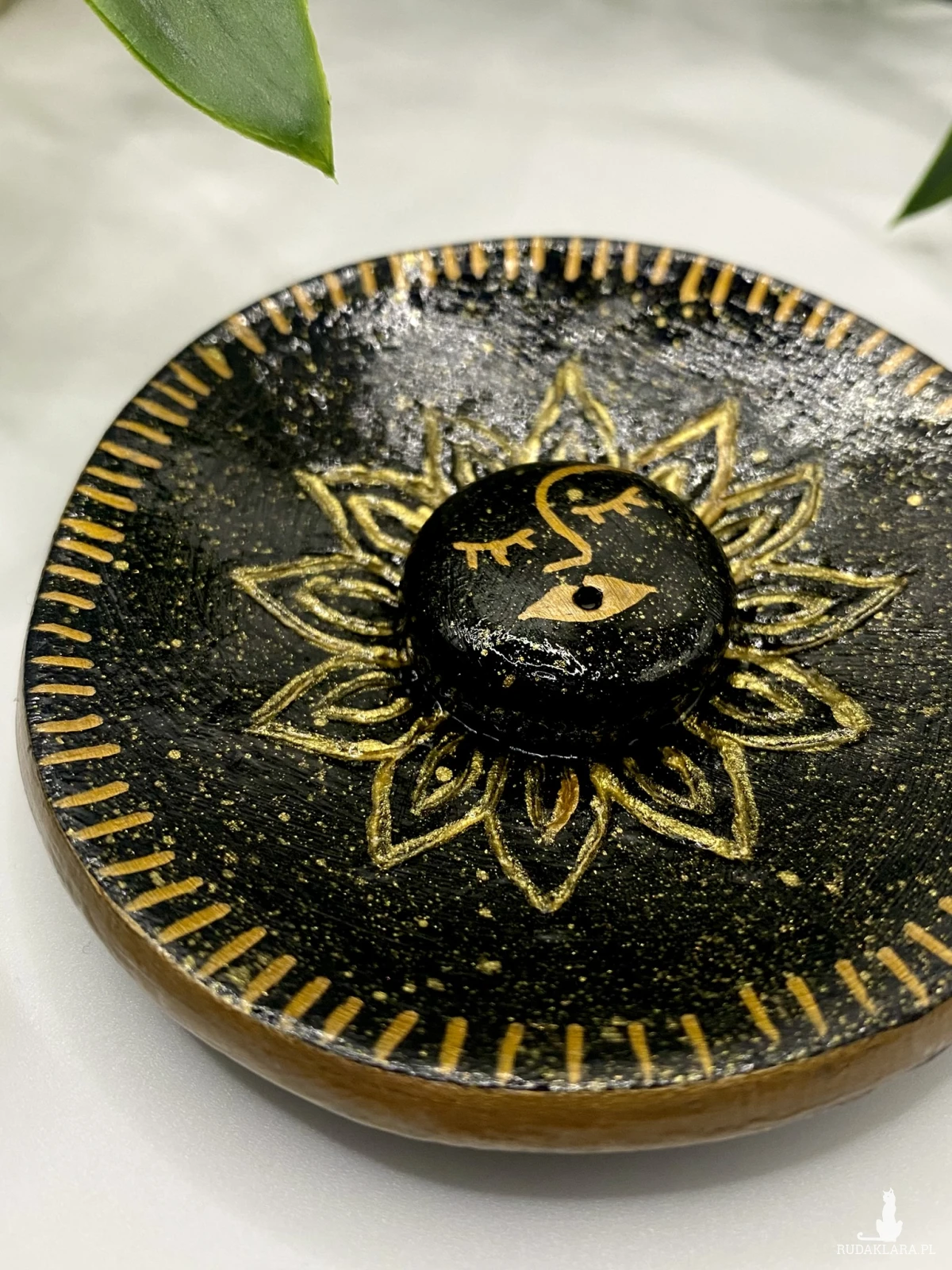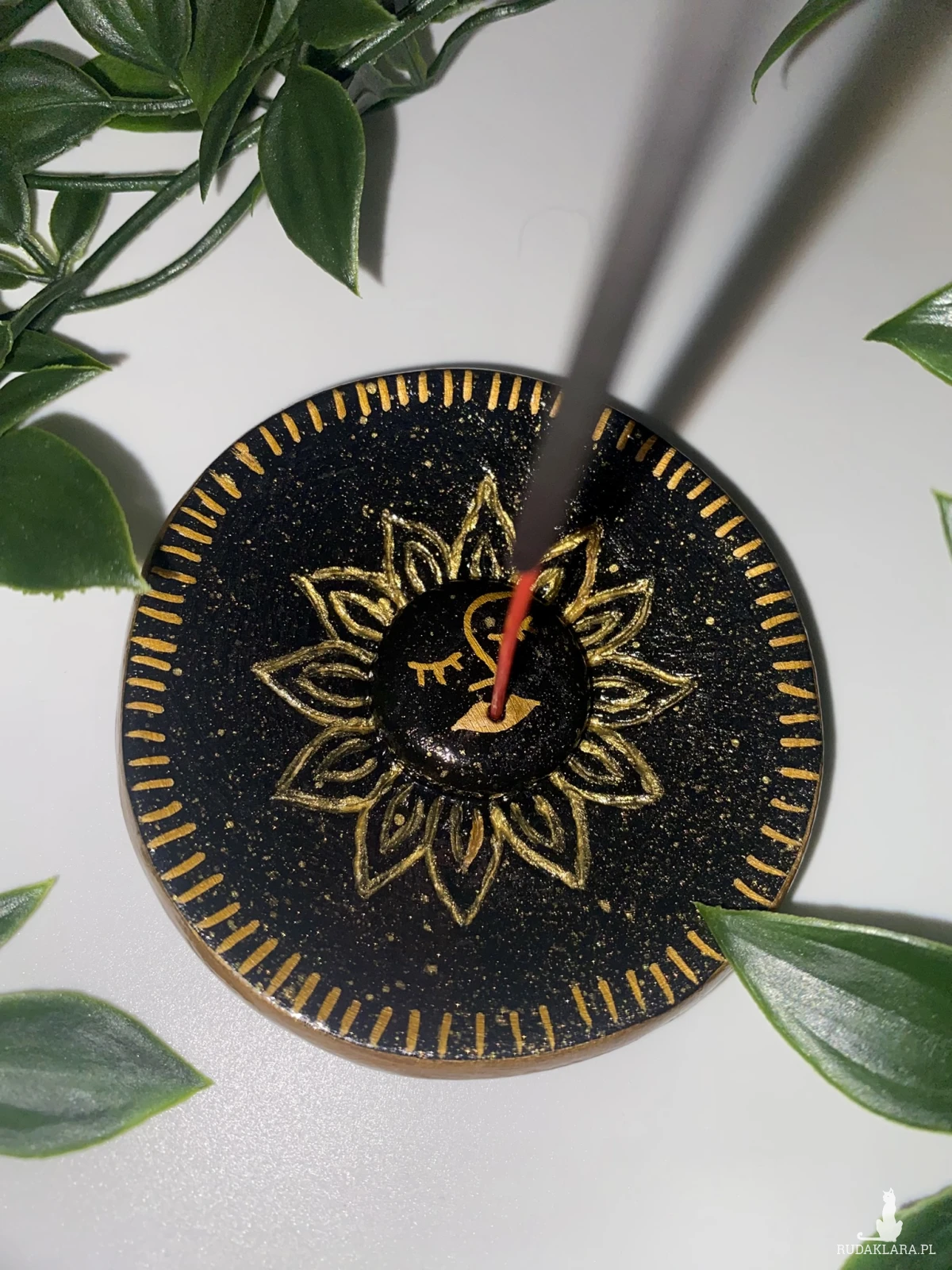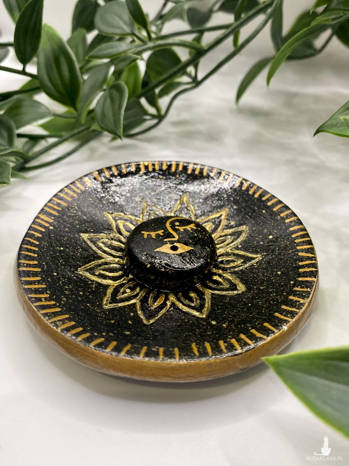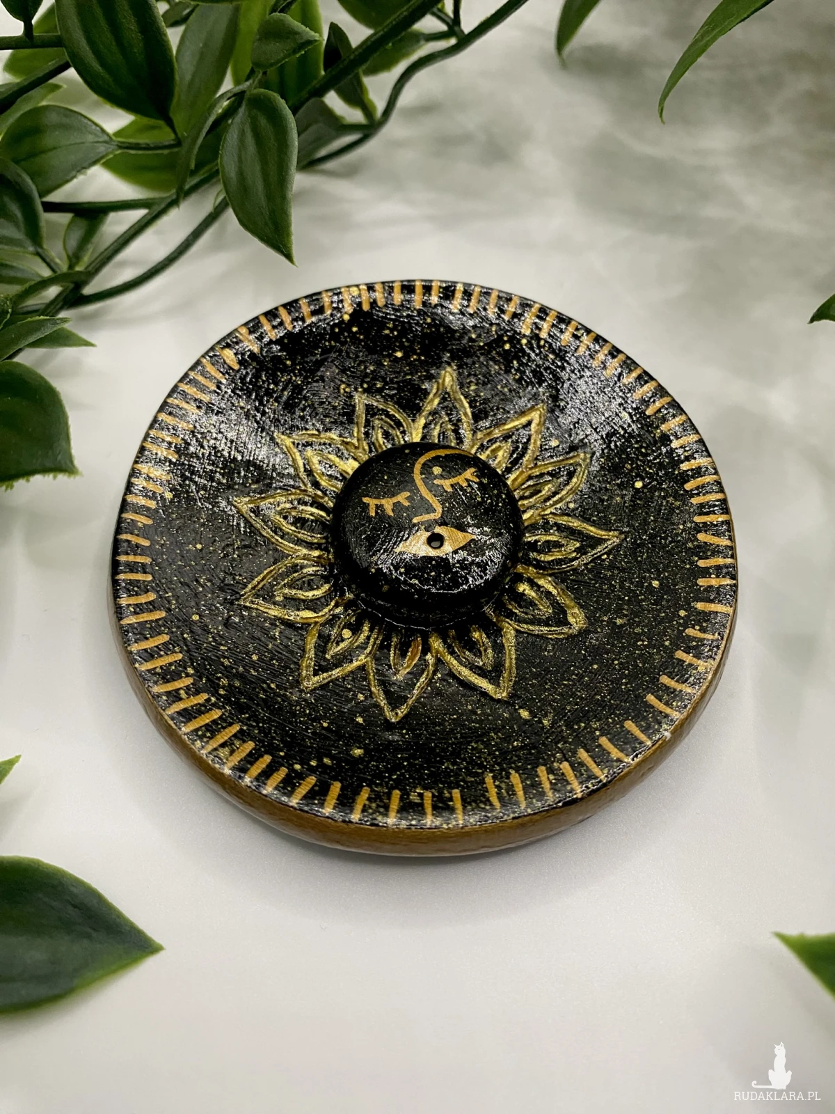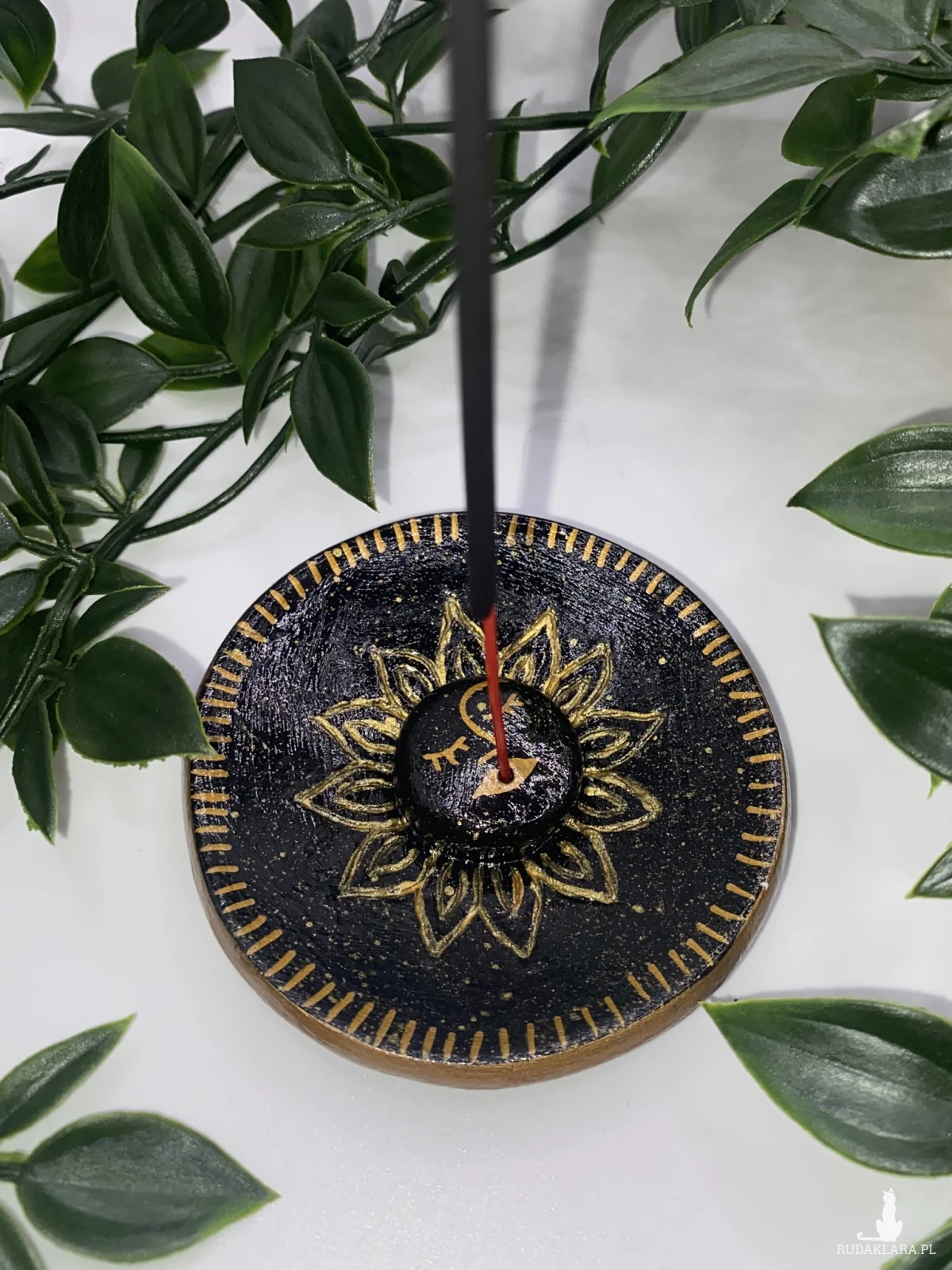 Podstawka z miejscem na kadzidło. Wykonana z gliny typu air dry clay. Pomalowana farbami akrylowymi i zabezpieczona specjalnym werniksem i lakierem.