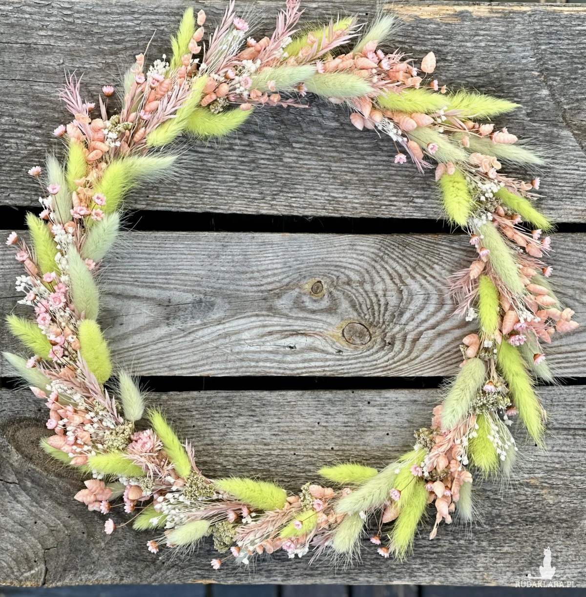 Wianek na metalowej obręczy wykonany z naturalnych, suszonych roślin w wiosennych kolorach.