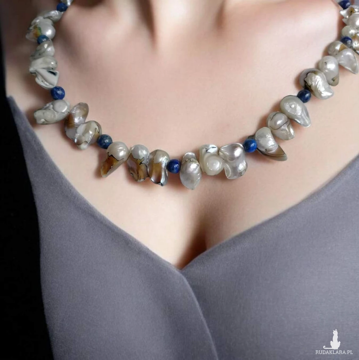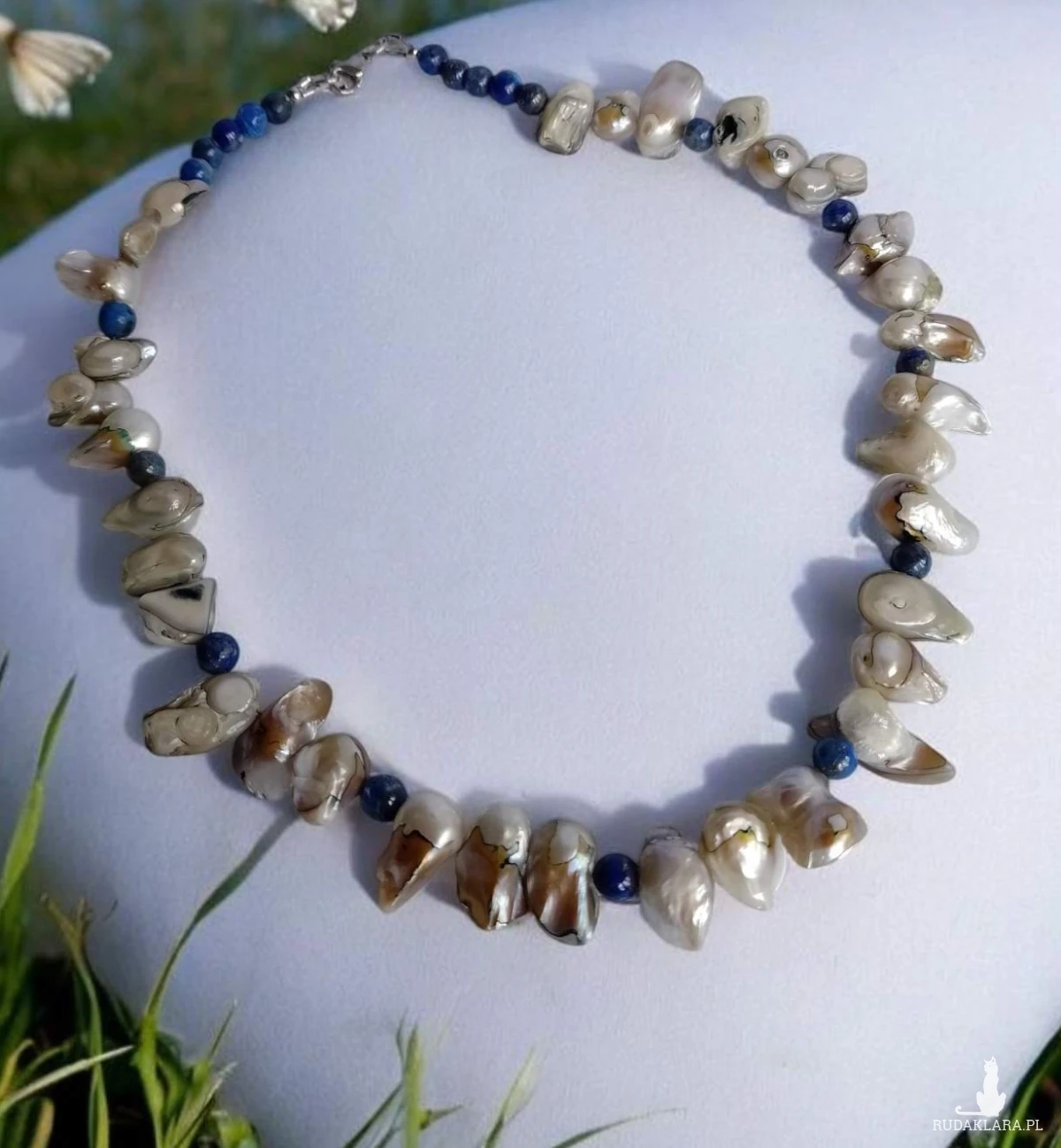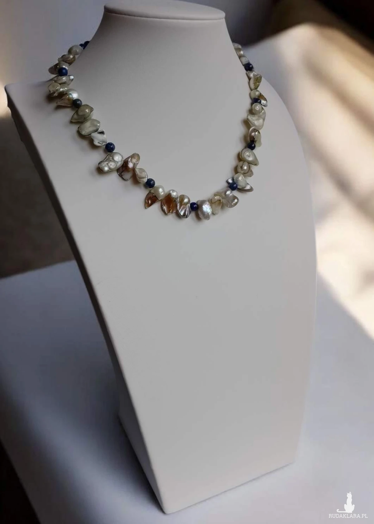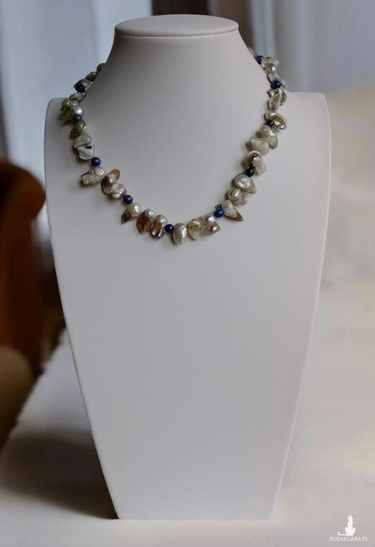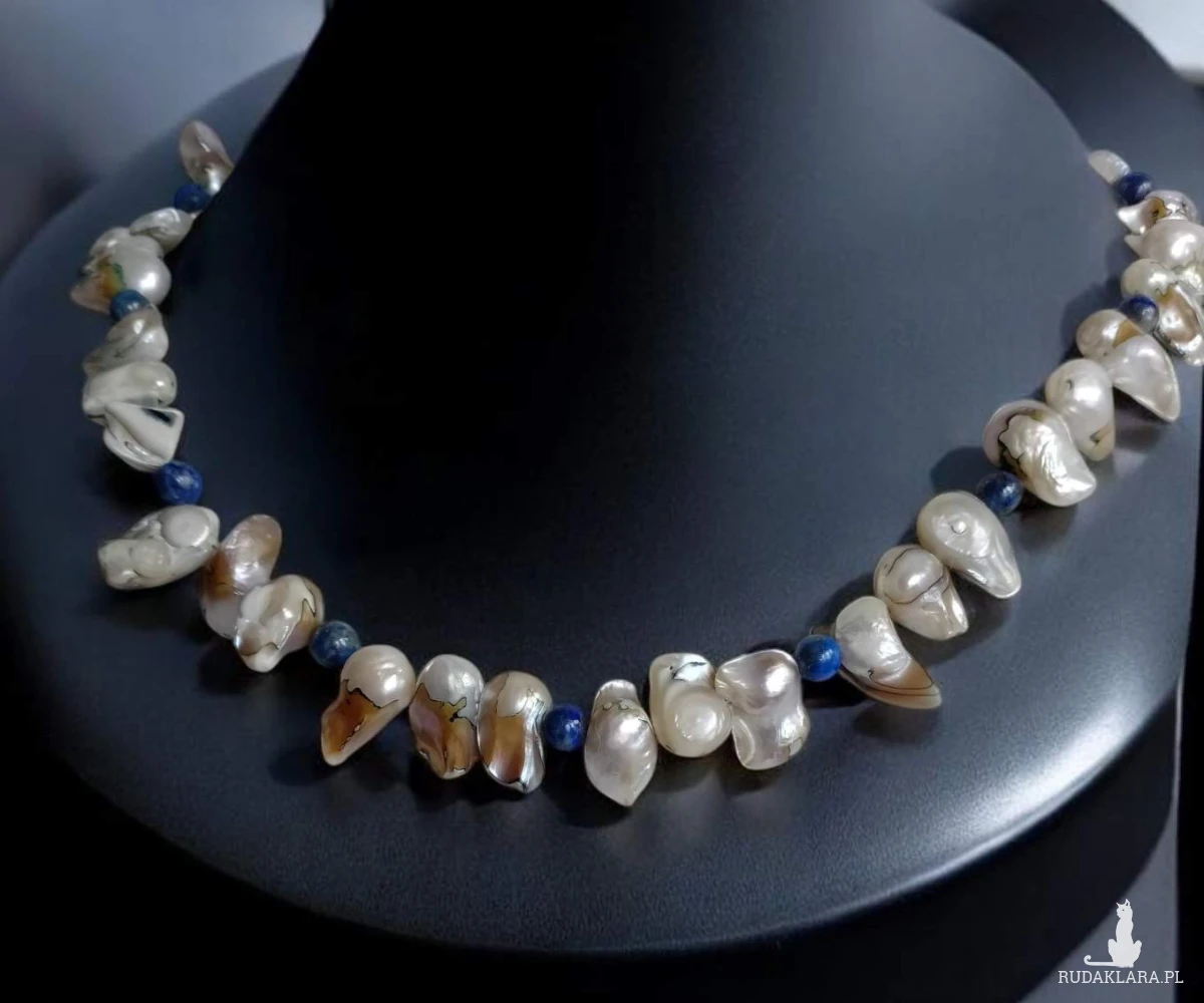 Wyjątkowy naszyjnik wykonany z pereł Keshi i 4 mm kulek lapis lazuli. .Perły Keshi mogą powstawać zarówno w słonej, jak i słodkiej wodzie mięczaków. Są one zazwyczaj niewielkie i ponieważ nie ma jądra, które mogłoby nadać ostateczny kształt perle, ich kształty są bardzo zróżnicowane. (inf. z internetu). Wielkość pereł w naszyjniku ok.20 x 0 ,5 mm. Elementy wykończenia i zapięcie na karabińczyk wykonano ze stali szlachetnej. Długość naszyjnika 43 cm.