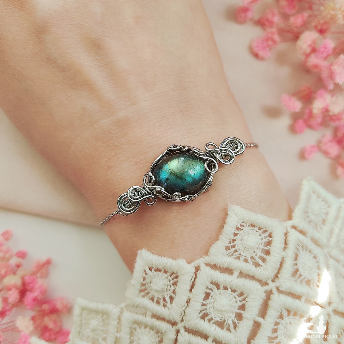 Bransoletka Labradoryt wykonana własnoręcznie. Wykonana techniką wire wrapping z drutów ze stali chirurgicznej.