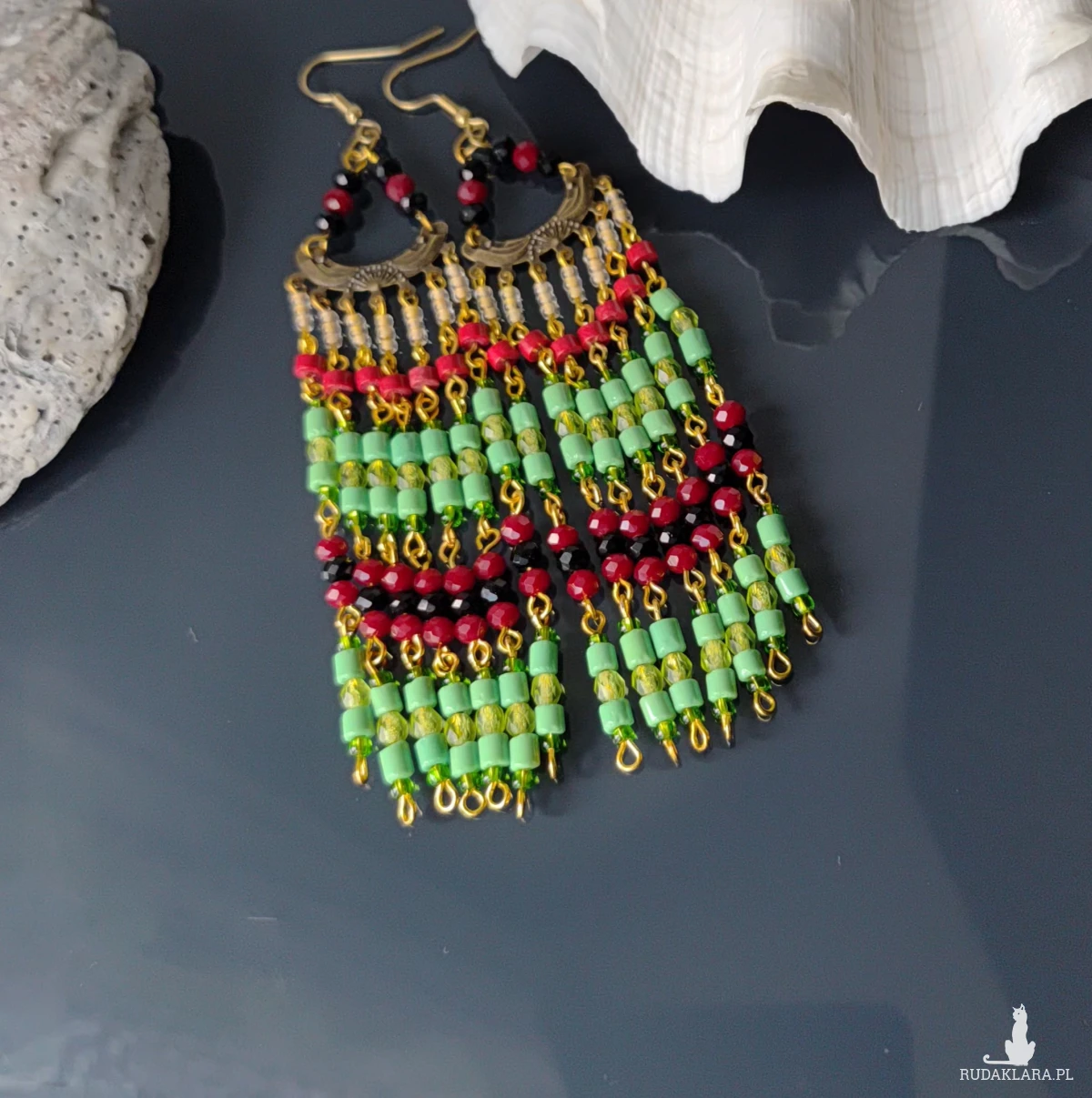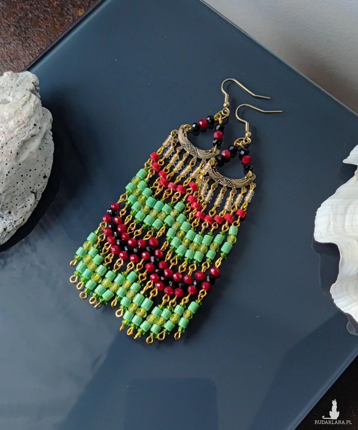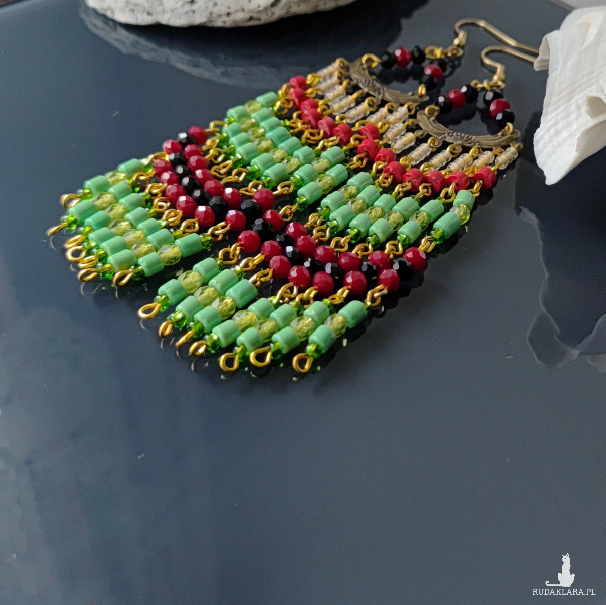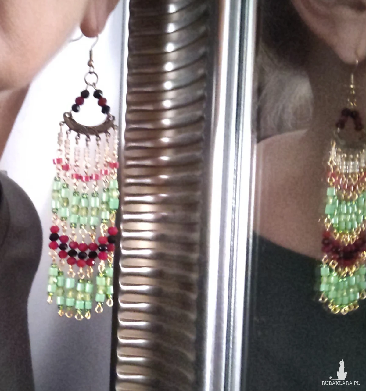 Długie wiszące kolczyki w klimacie orientu. Długie i duże. Indyjskie boho, etno. Wyjątkowa biżuteria. Doskonała na lato, idealnie sprawdzi sie do letnich kreacji. Długość z biglem 12,5 cm Bigle ze stali nierdzewnej. Element metalowy ozdobny. Stal, metal, szkło.