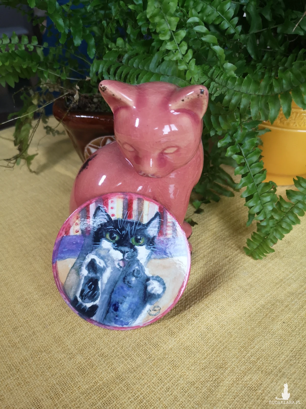 Okrągła podkładka pod kubek przedstawiająca mojego kota Józika z zabawką rybą. Średnica 9, 7 cm. Wydruk akwareli laminowany, na korku.