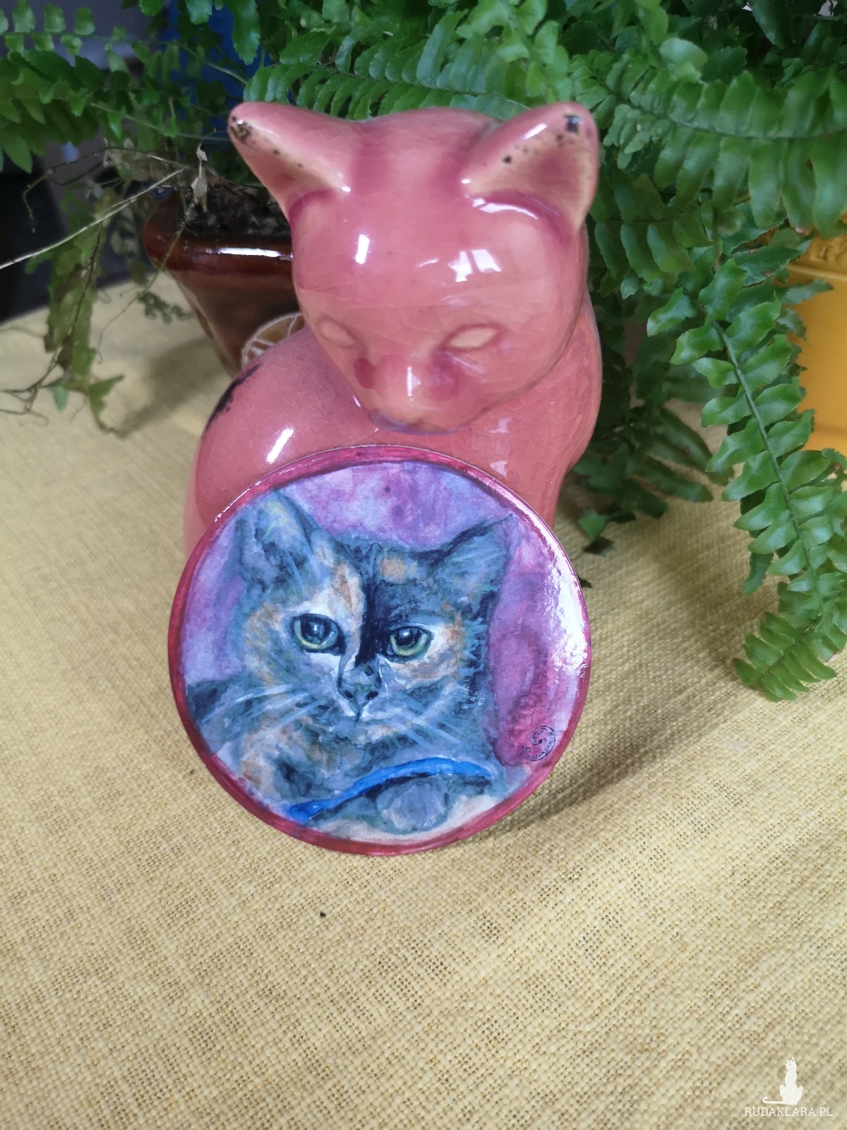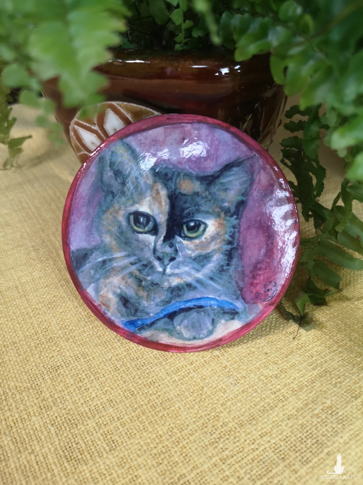 Okrągła podkładka pod kubek przedstawiająca moją szylkretową kotkę Duszkę, która zza tęczowego mostu patronuje mojej działalności malarskiej. Średnica  9, 7 cm. Wydruk akwareli laminowany, na korku.
