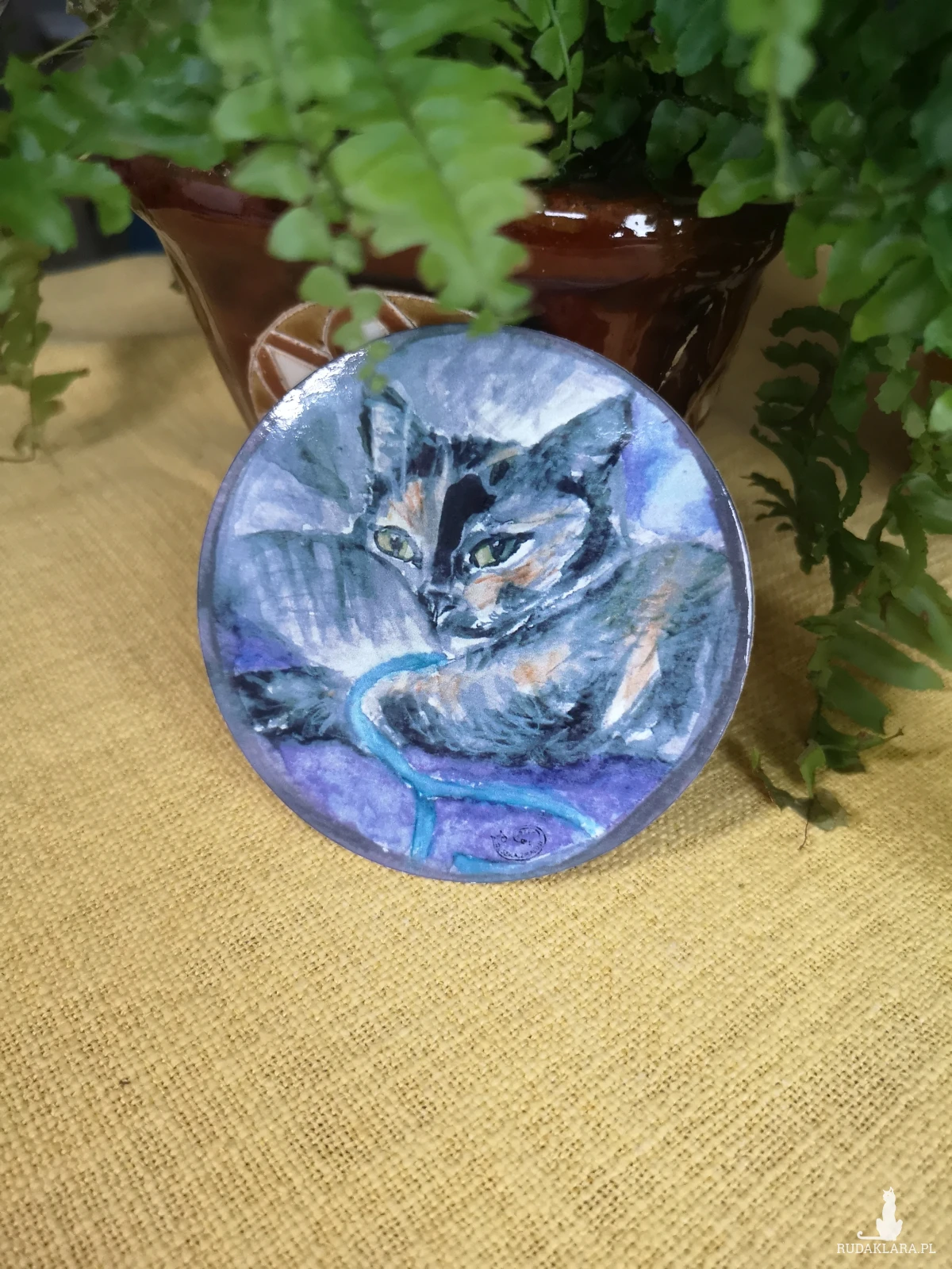 Okrągła podkładka pod kubek przedstawiająca moją szylkretową kotkę Duszkę, która zza tęczowego mostu patronuje mojej działalności malarskiej. Średnica 9, 7 cm. Wydruk akwareli laminowany, na korku.