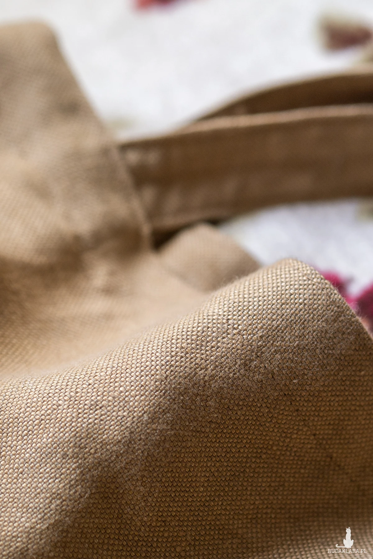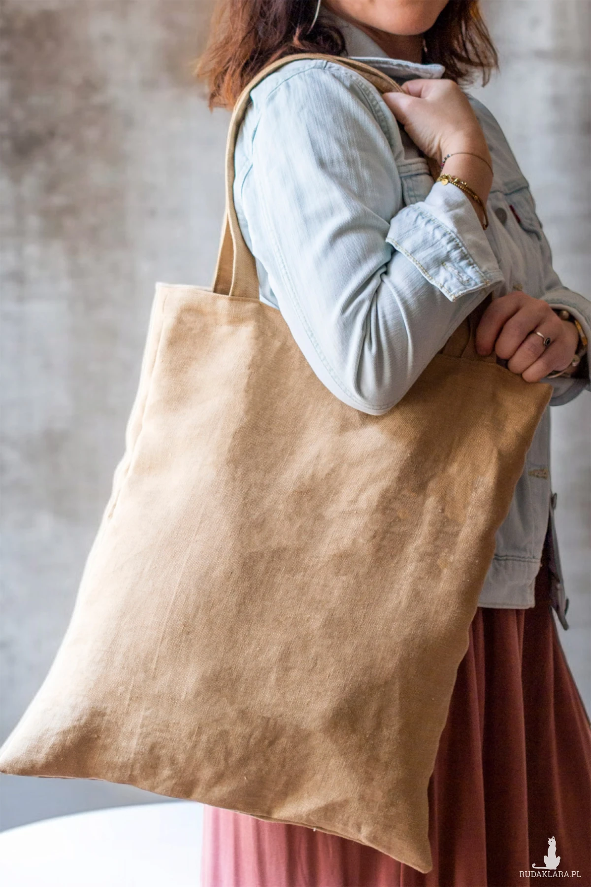 Duża torba na ramię typu shopper wykonana z płótna w kolorze karmelowym.