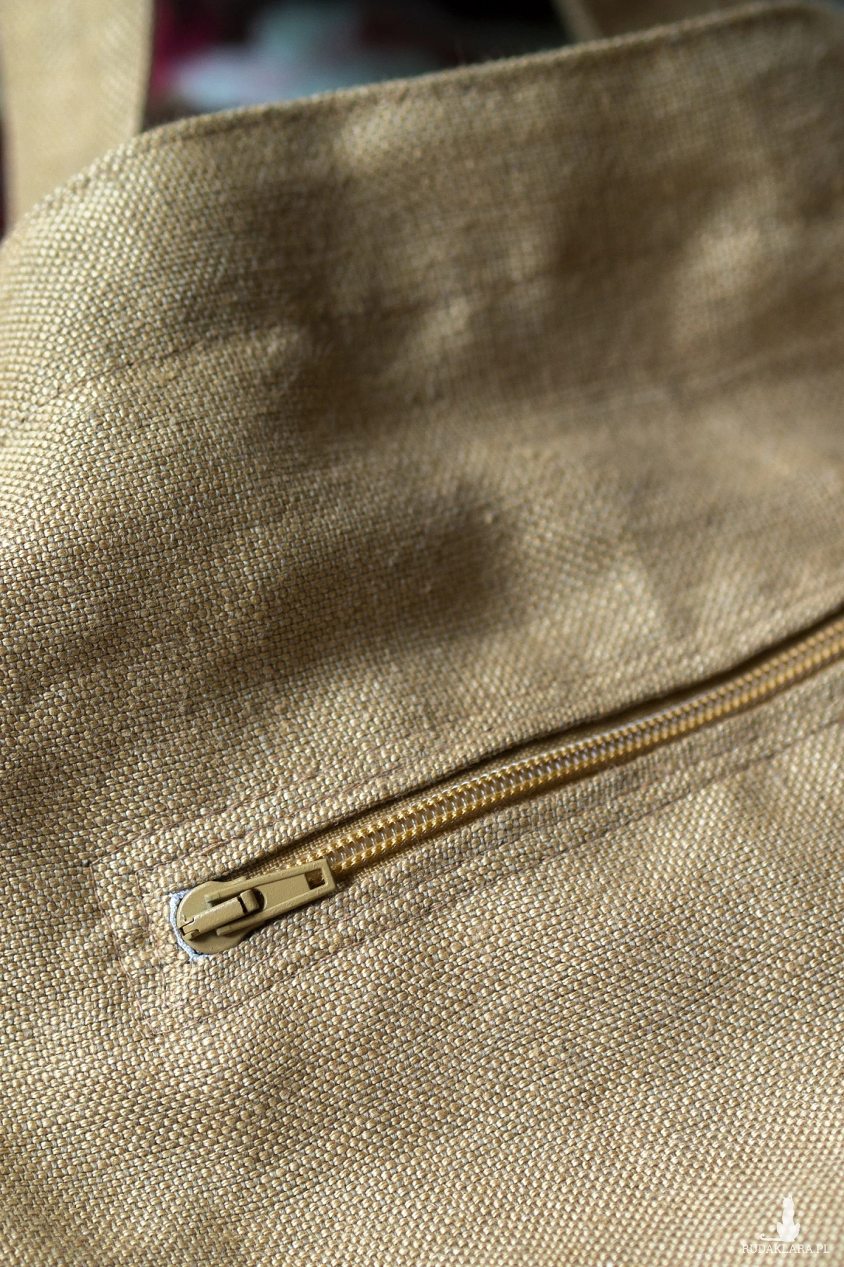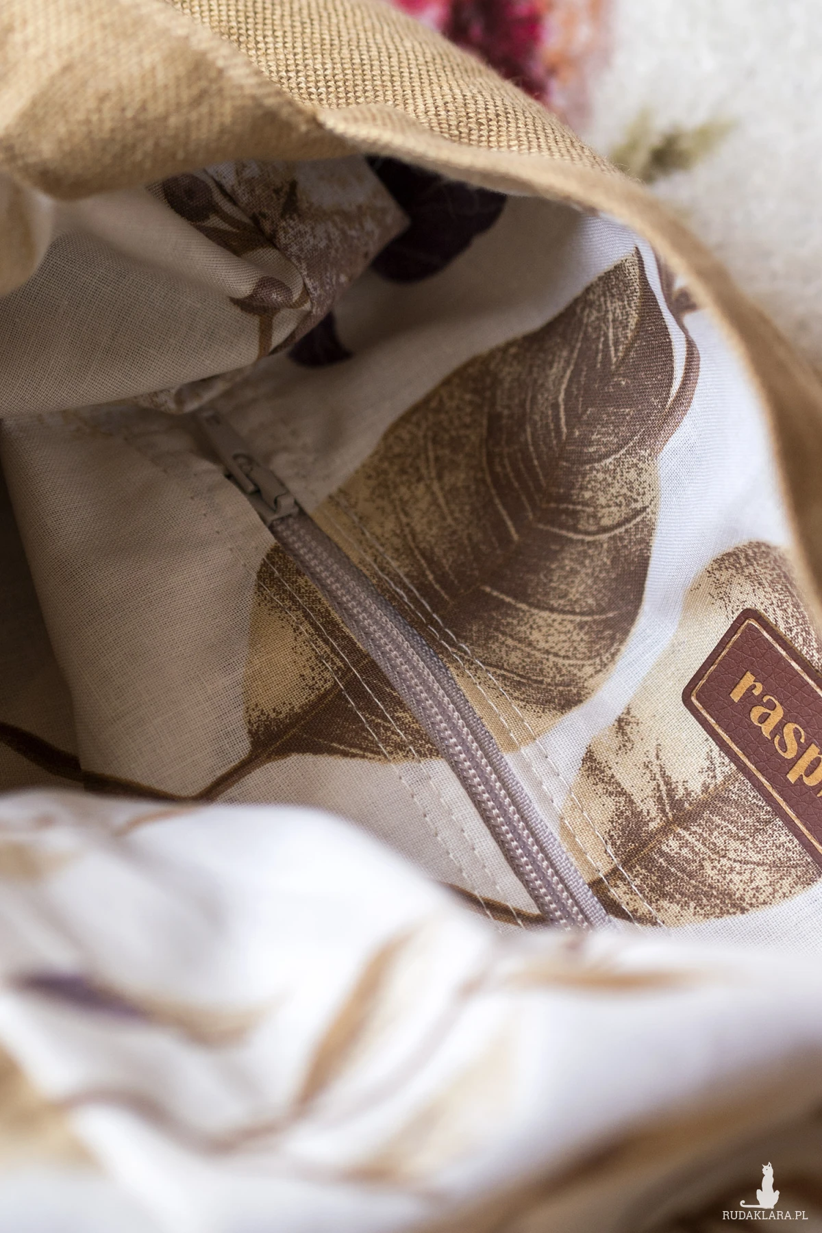 Torebka posiada bawełnianą podszewkę w kwiaty, a w środku kieszeń zapinaną na suwak. Z tyłu torby znajduje się dodatkowa kieszonka zapinana na suwak.