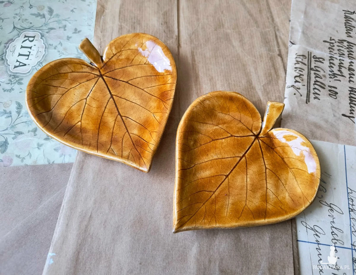 Mydelniczki ceramiczne w kształcie liścia lipy, wykonane z gliny szamotowej wypalone na biskwit, a następnie szkliwione w temperaturze 1260 stopni C. Wymiary ok 13,5 x 11,5 cm cm. W pięknej miodowej kolorystyce. Idealne do ozdoby domu lub jako prezent okolicznościowy. Serdecznie polecam!!!