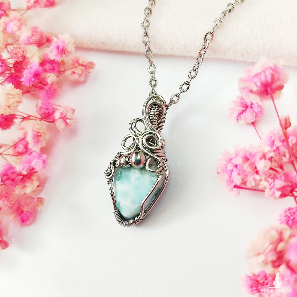 Naszyjnik Larimar ręcznie robiony. Wykonany techniką wire wrapping z drutów ze stali chirurgicznej.