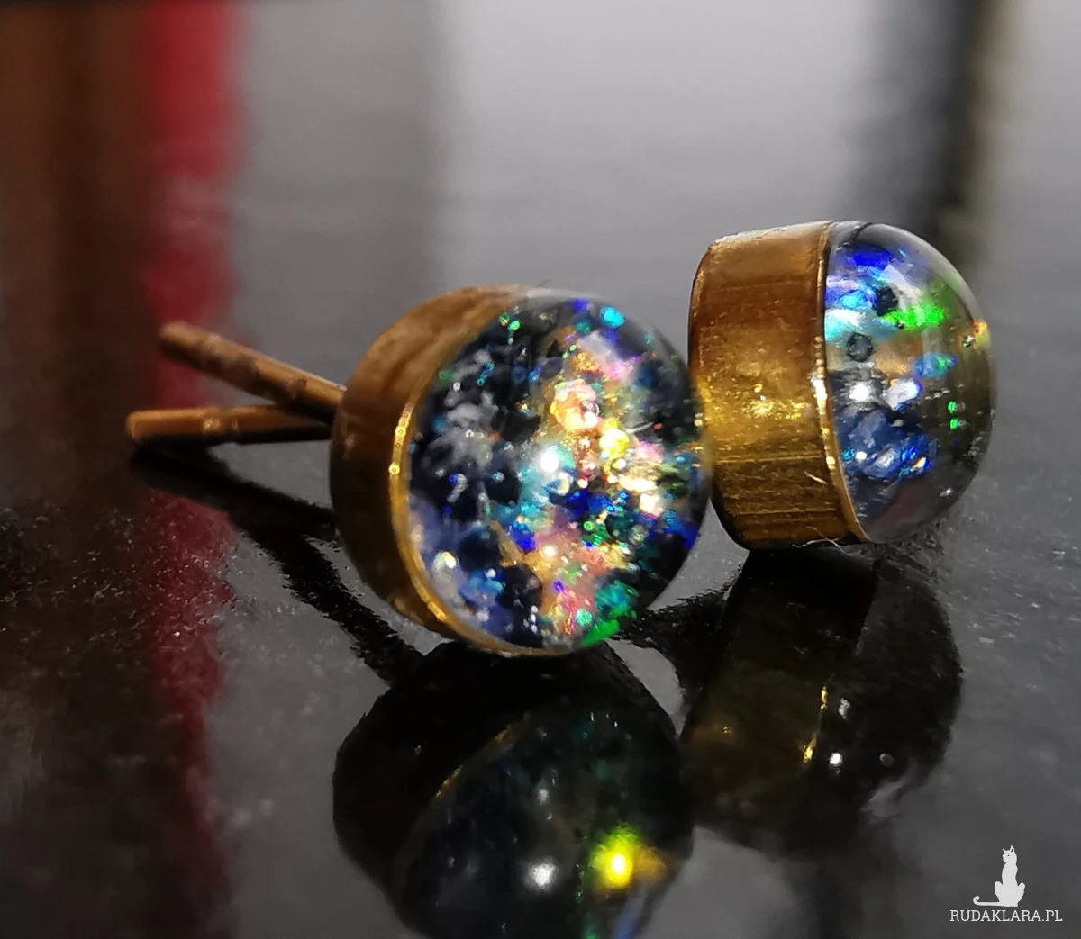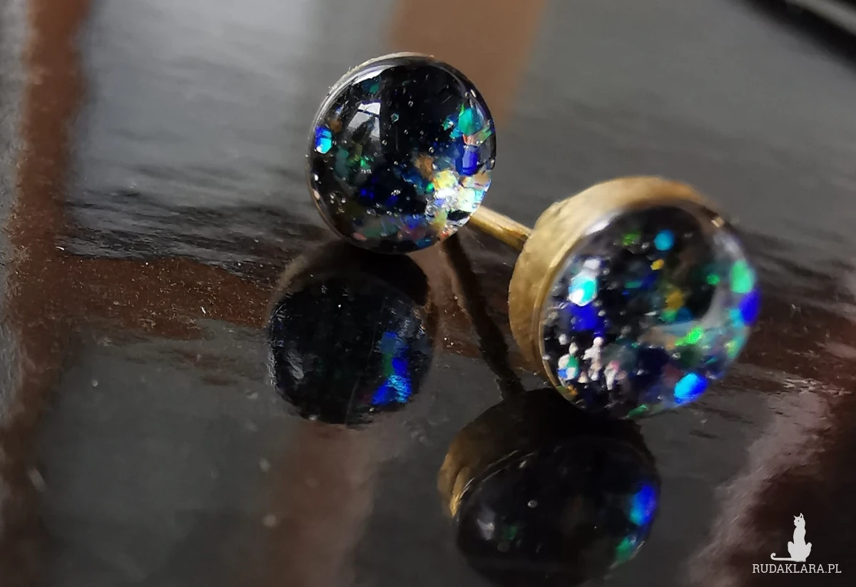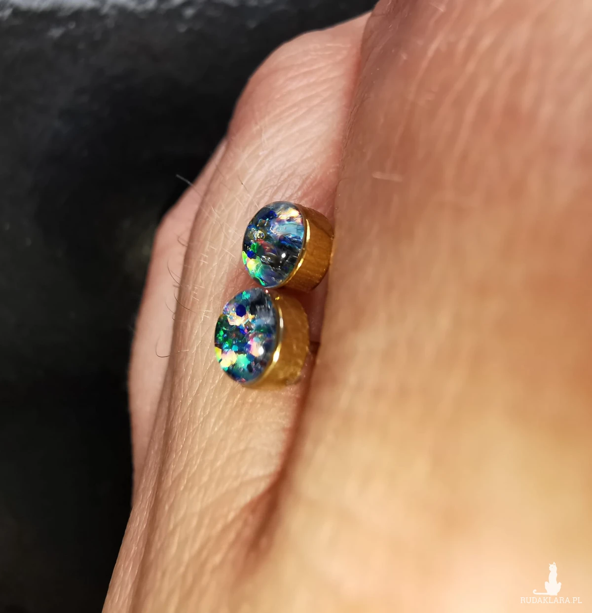Drobne kolczyki stalowe 4mm, ręcznie wypełnione żywicą epoksydową i brokatami. Mocno się mienia różnymi kolorami. Są gustownym dodatkiem do różnych stylizacji.
