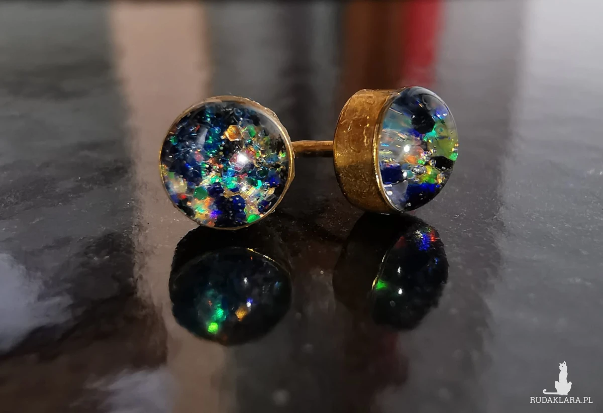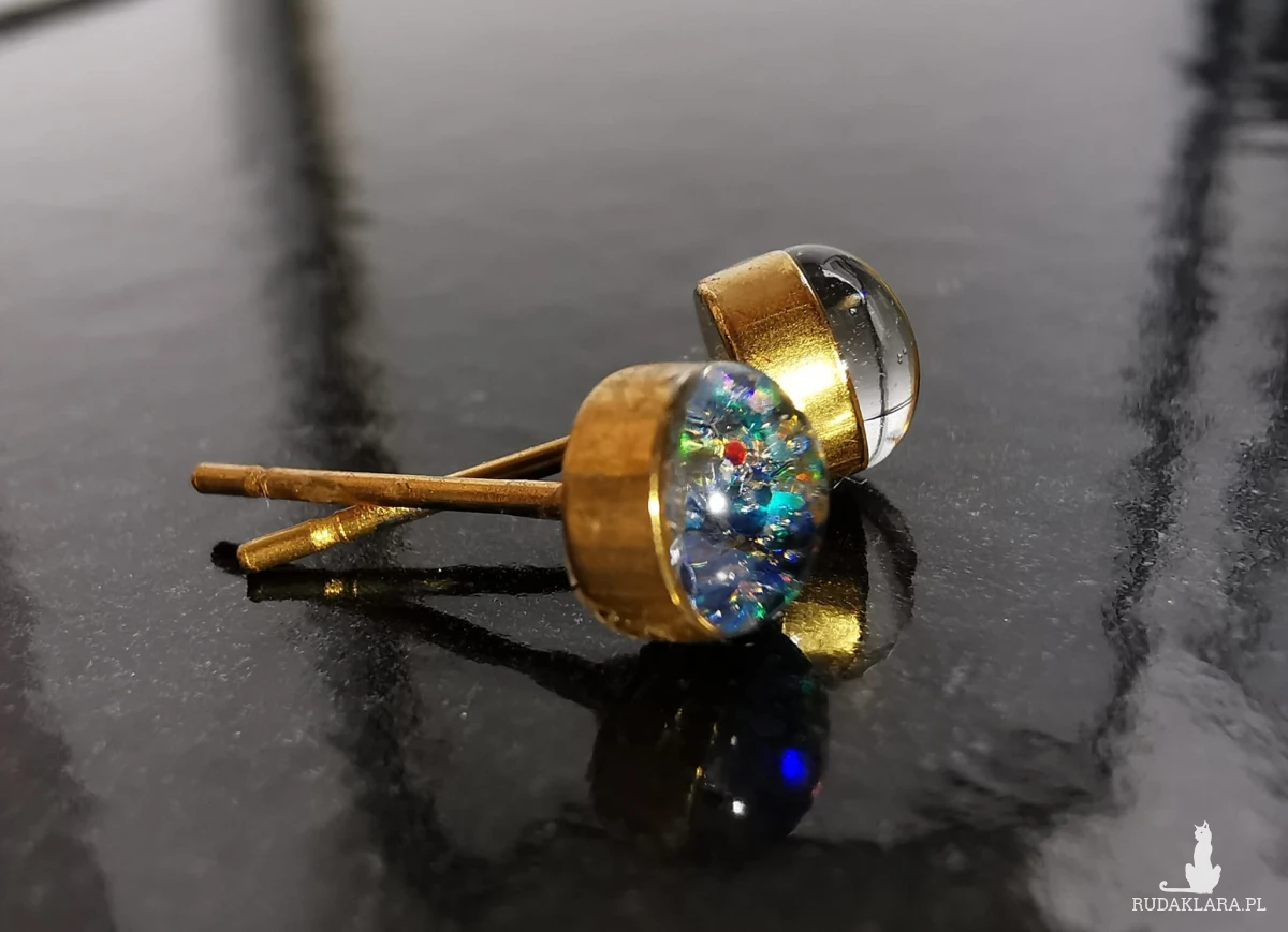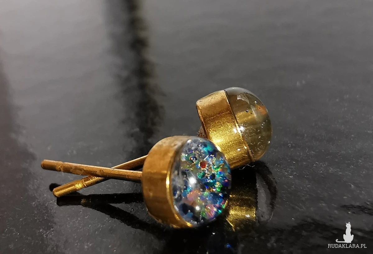 Drobne kolczyki stalowe 4mm, ręcznie wypełnione żywicą epoksydową i brokatami. Mocno się mienia różnymi kolorami. Są gustownym dodatkiem do różnych stylizacji.