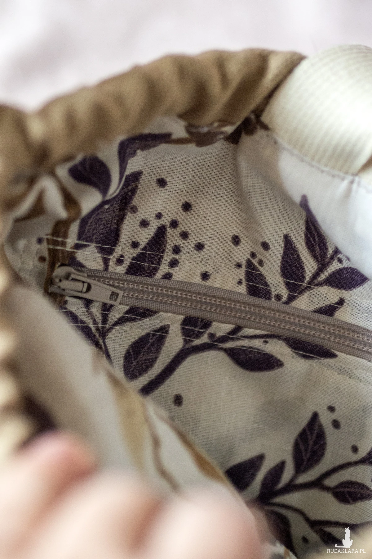 Wykonany z płóciennej jasnobrązowej tkaniny. Z przodu oraz z na tyle torebki kieszenie (np. na telefon czy chusteczki) z grubego sztruksu w kwiaty w kolorze ecru.