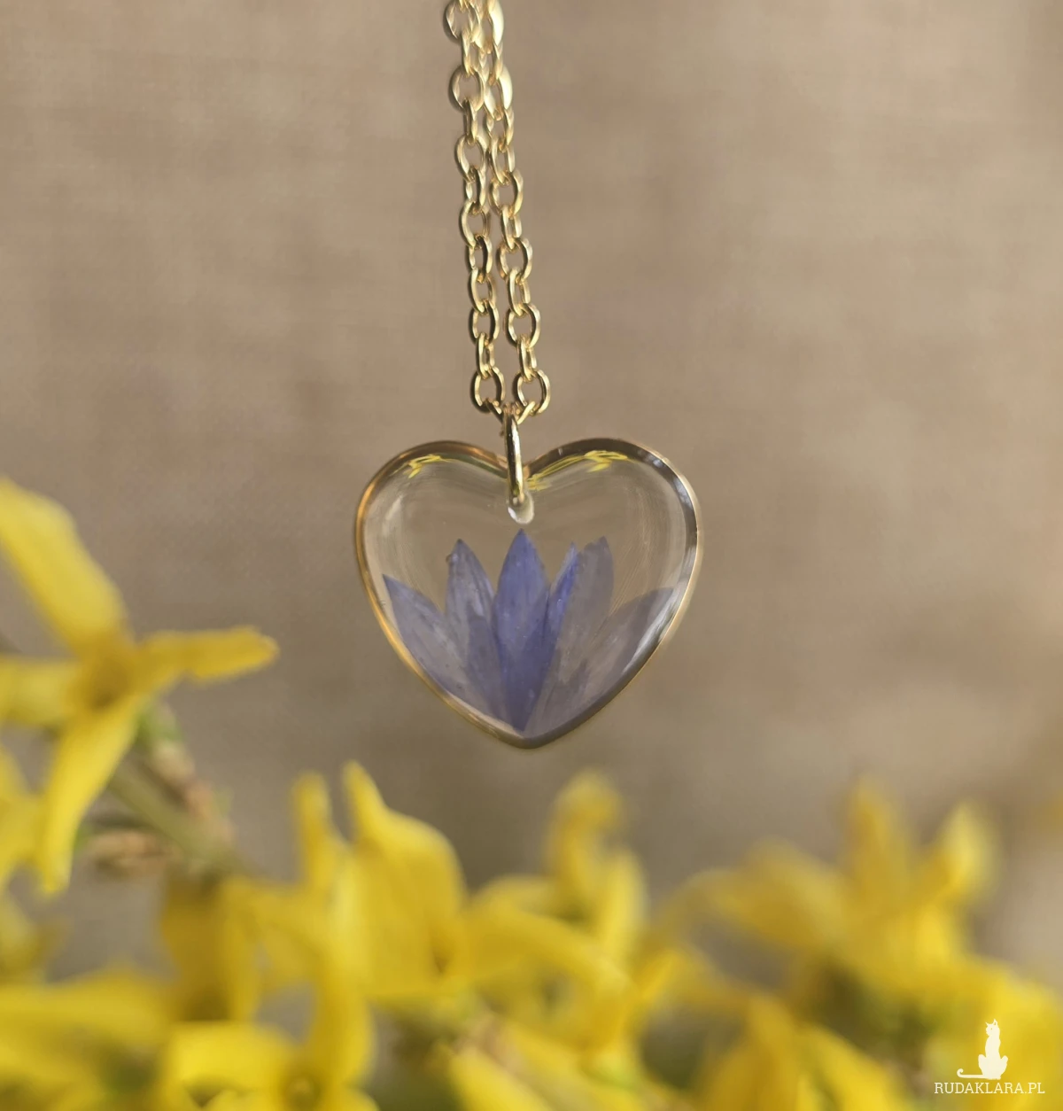 Oferuję Państwu unikalną biżuterię. Zawieszka jest wykonana z suszonych kwiatów i żywicy epoksydowej. Biżuteria jest wspaniałym i oryginalnym prezentem na lata.