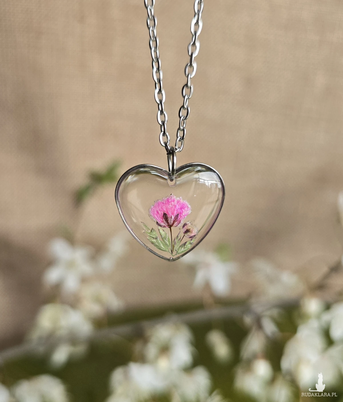 Oferuję Państwu unikalną biżuterię. Zawieszka jest wykonana z suszonych kwiatów i żywicy epoksydowej. Biżuteria jest wspaniałym i oryginalnym prezentem na lata.