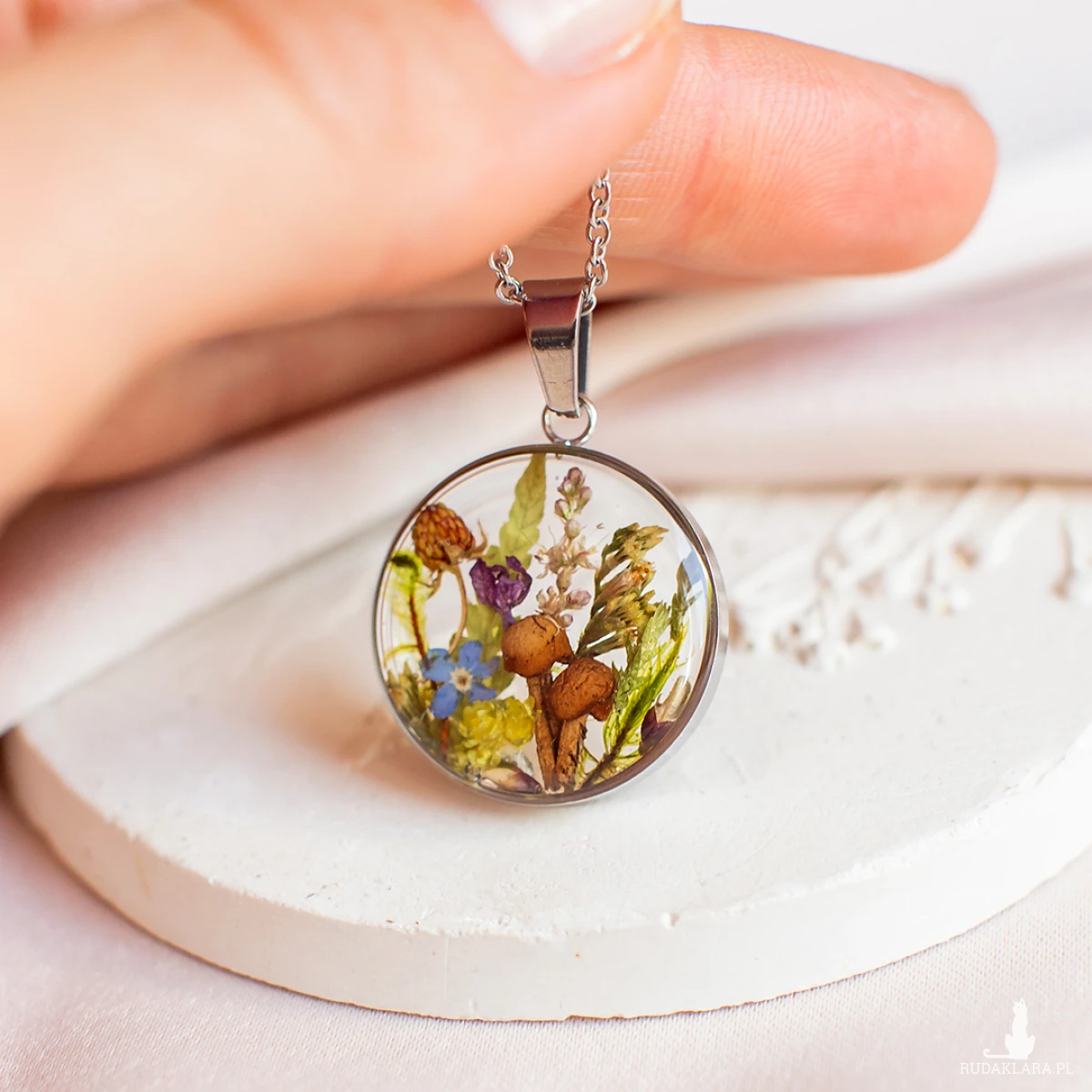 Wisiorek wykonany jest z żywicy epoksydowej z wykorzystaniem suszonych kwiatów. Metalowe elementy to stal nierdzewna szlachetna chirurgiczna.