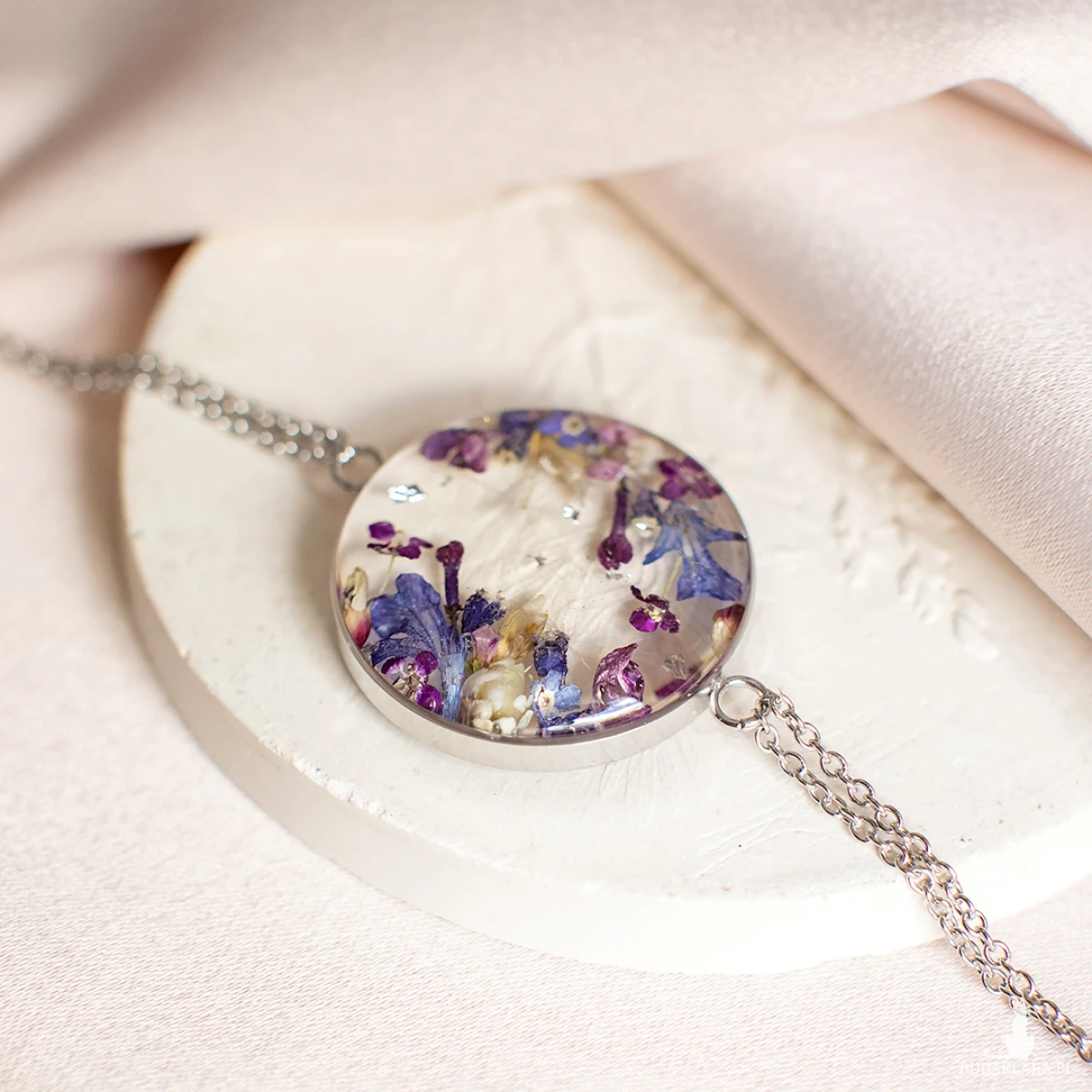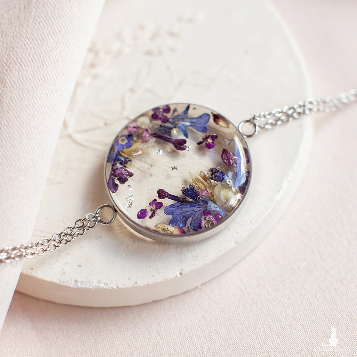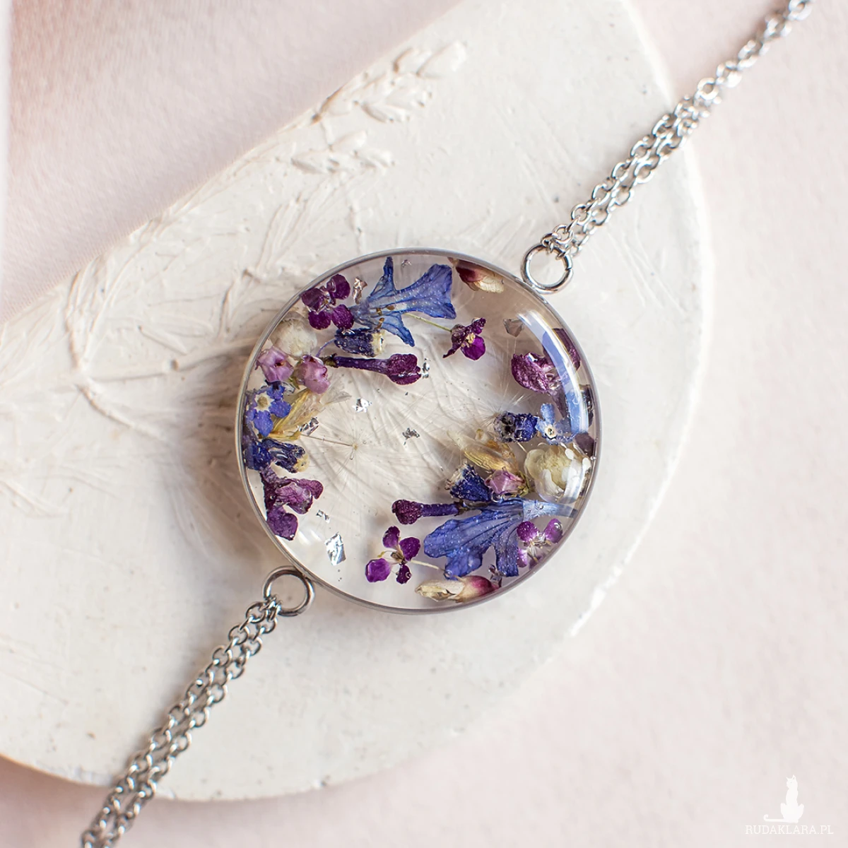 Bransoletka wykonana jest z żywicy epoksydowej z wykorzystaniem suszonych kwiatów. Metalowe elementy to stal nierdzewna szlachetna chirurgiczna