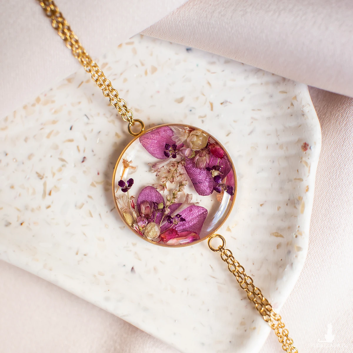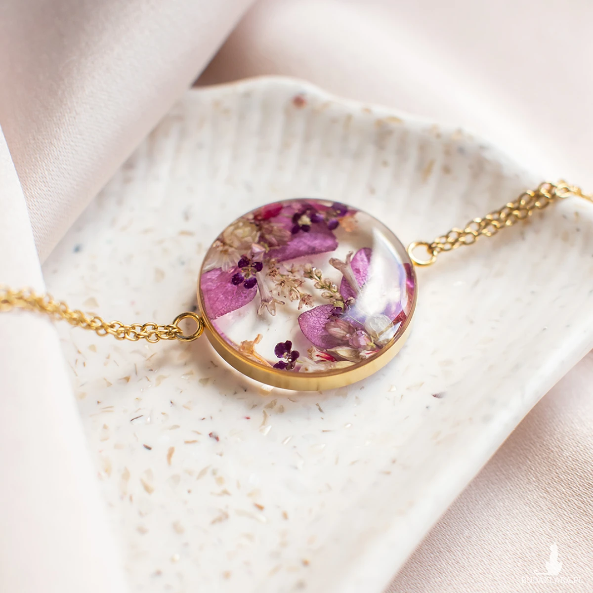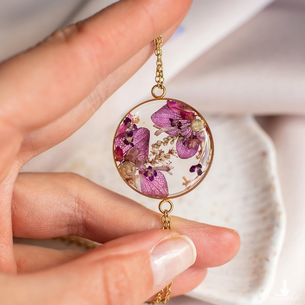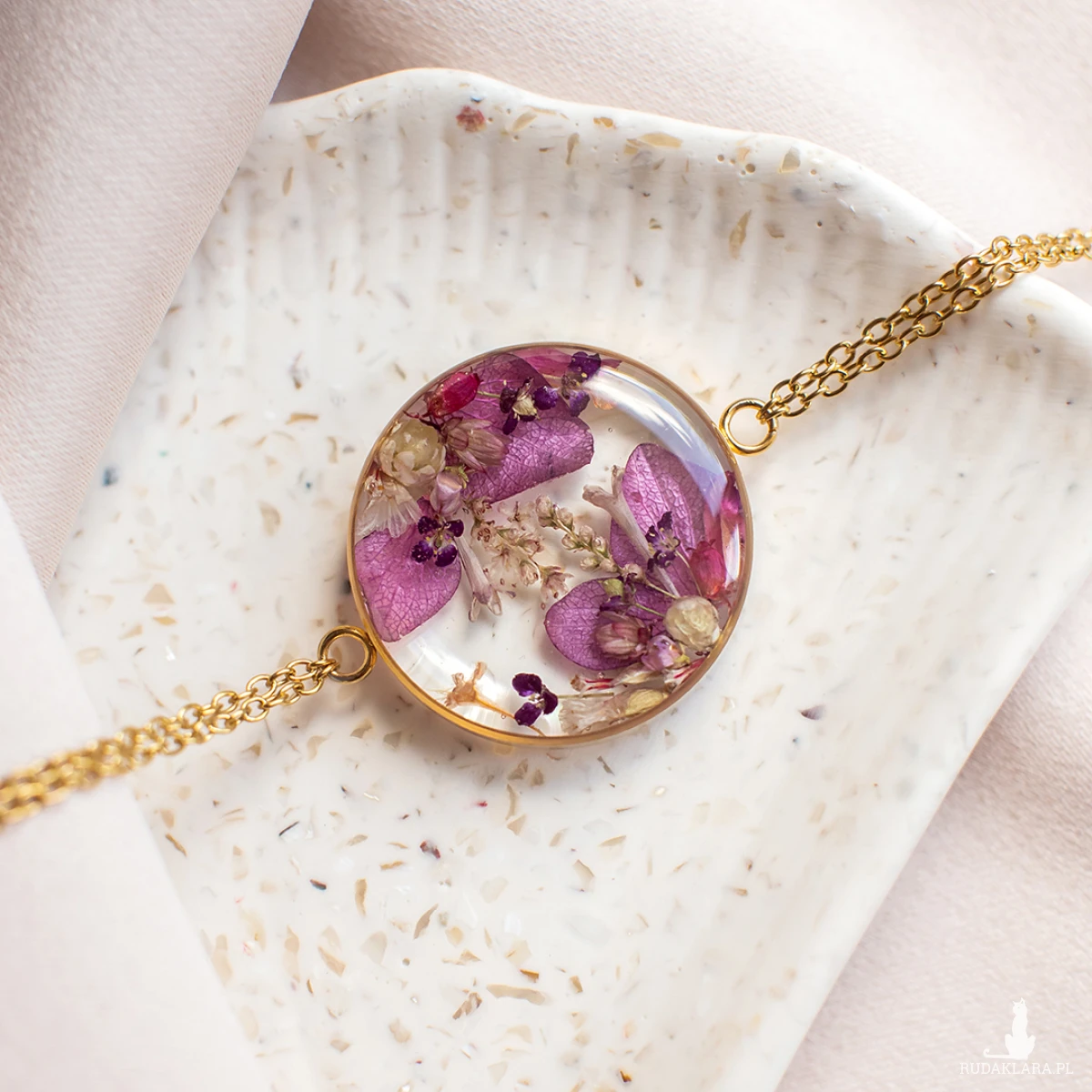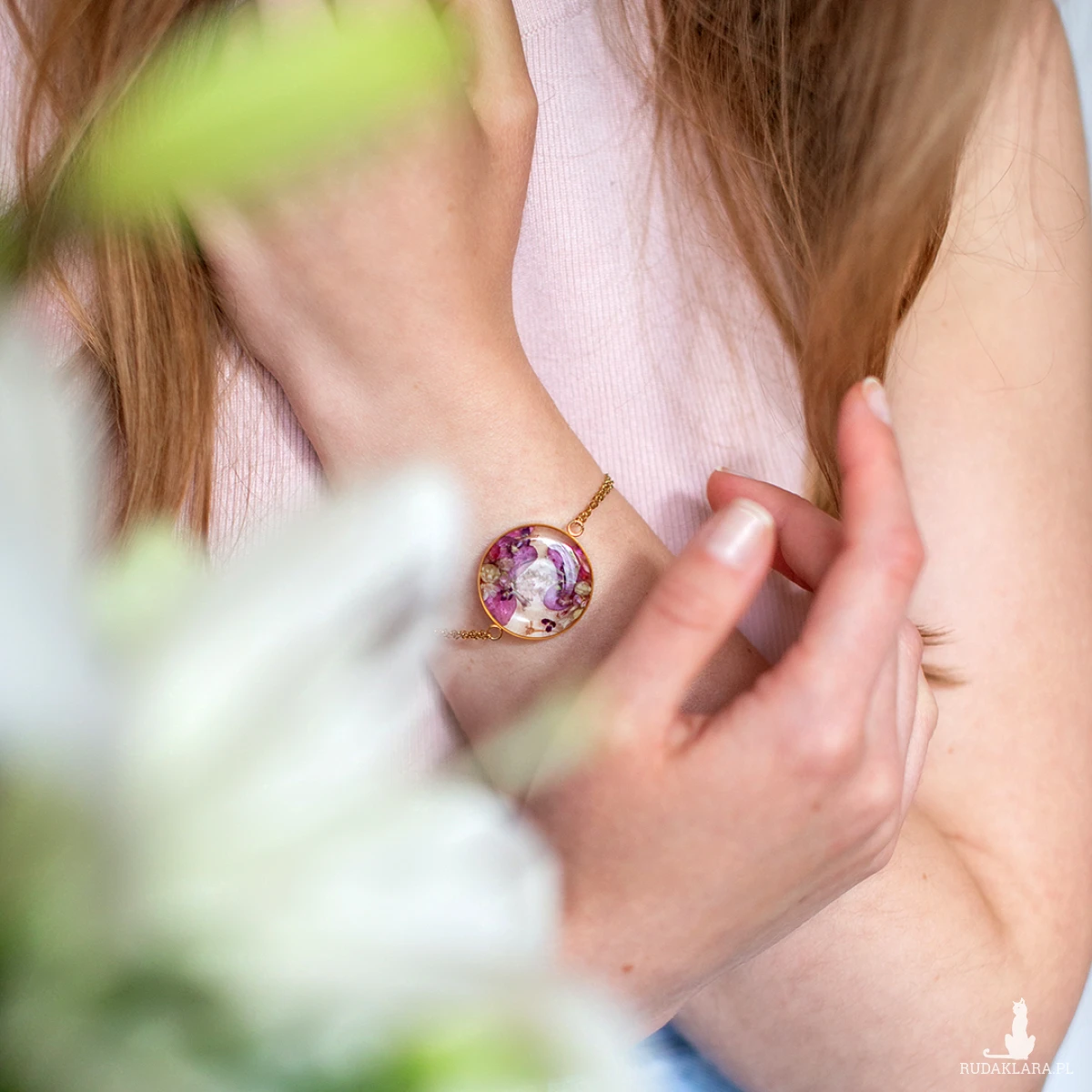 Bransoletka wykonana jest z żywicy epoksydowej z wykorzystaniem suszonych kwiatów. Metalowe elementy to stal nierdzewna szlachetna chirurgiczna