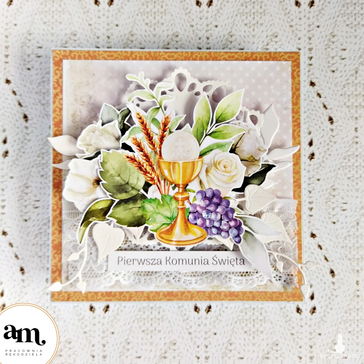 Przedstawiam Wam ręcznie wykonaną kartkę przestrzenną, która sprawdzi się idealnie jako Pamiątka Pierwszej Komunii Świętej. Cała praca utrzymana w subtelnej kolorystyce.