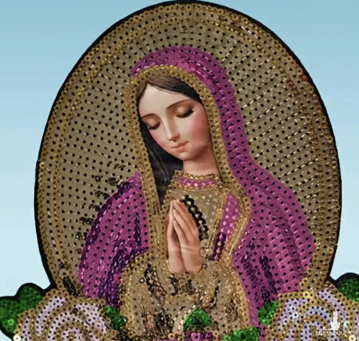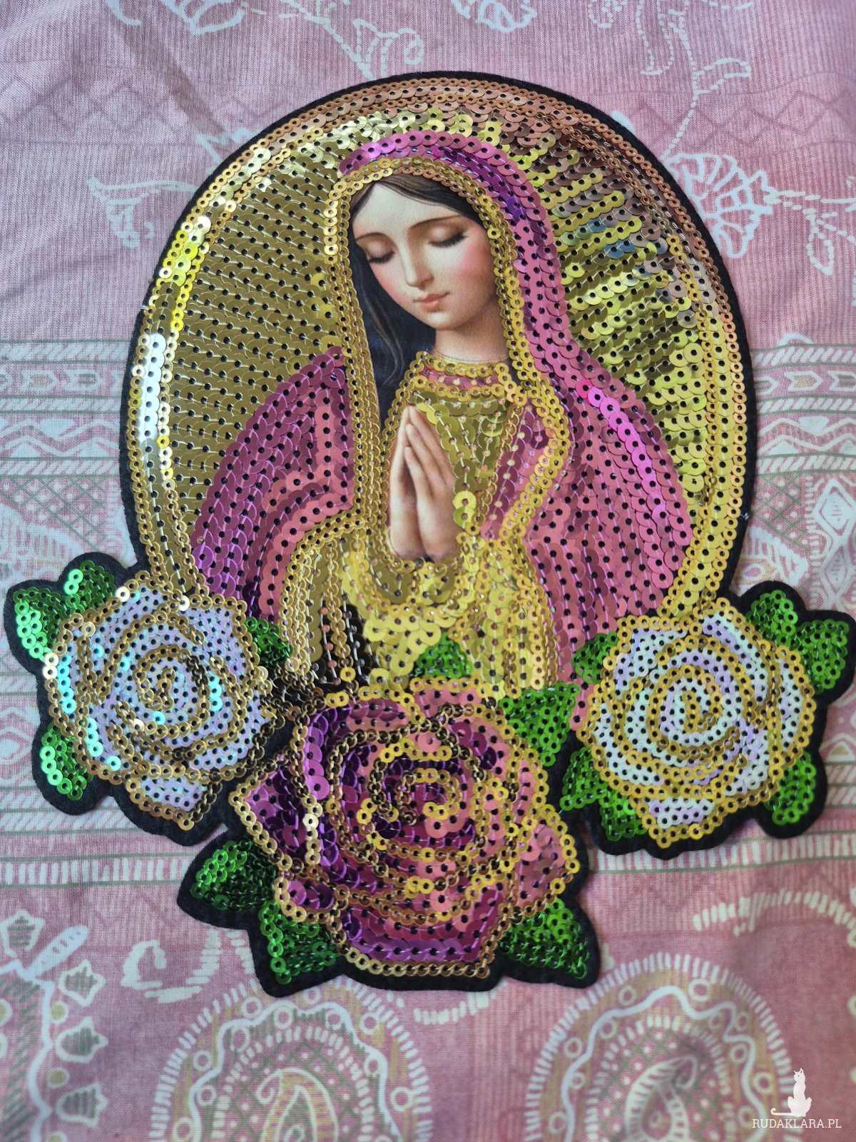 Duza cekinowa naszywka Matka Boska, piekna, swietna do naszycia na kurtke jeansowa, sweter, płaszcz. Sprowadzana ze wschodu, mega kolorowa, wielkosc 22na 18cm,polecam