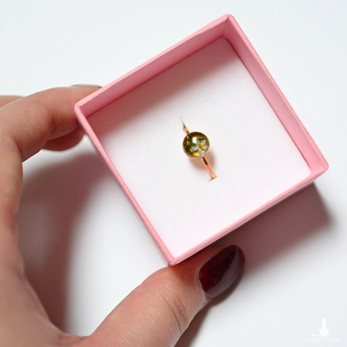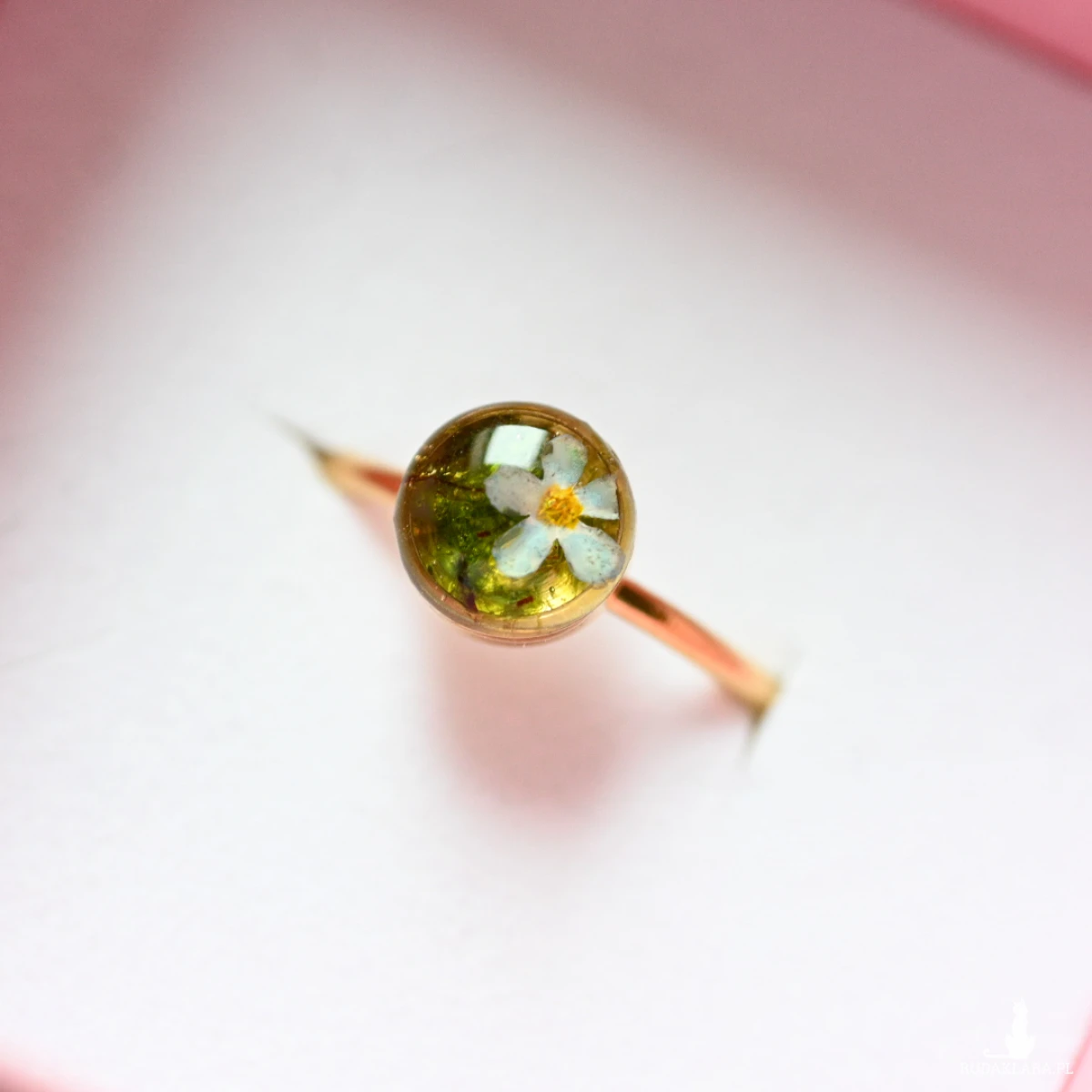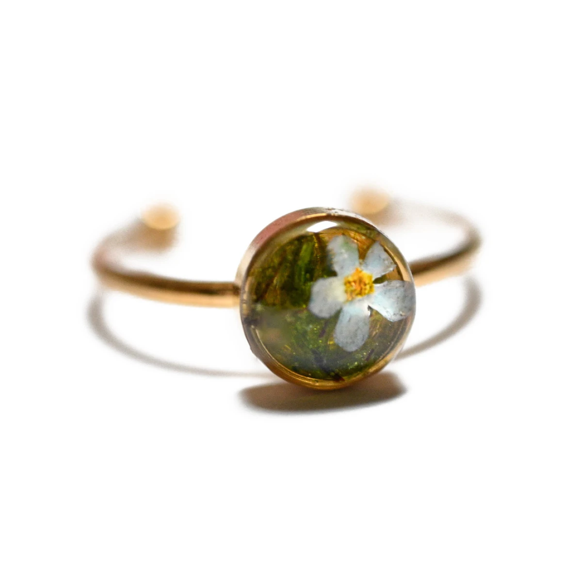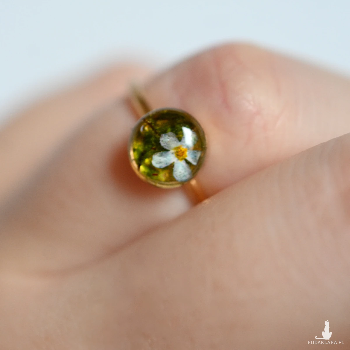 Złoty pierścionek regulowany ze stali chirurgicznej, w którym zatopiona jest prawdziwa niezapominajka i mech. Każdy egzemplarz jest tworzony ręcznie – kwiaty sama sieję, zbieram, suszę i zatapiam w żywicy, a następnie szlifuję i obrabiam. Dzięki regulacji pasuje na różne rozmiary palców. Trwały, hipoalergiczny, nie ciemnieje.