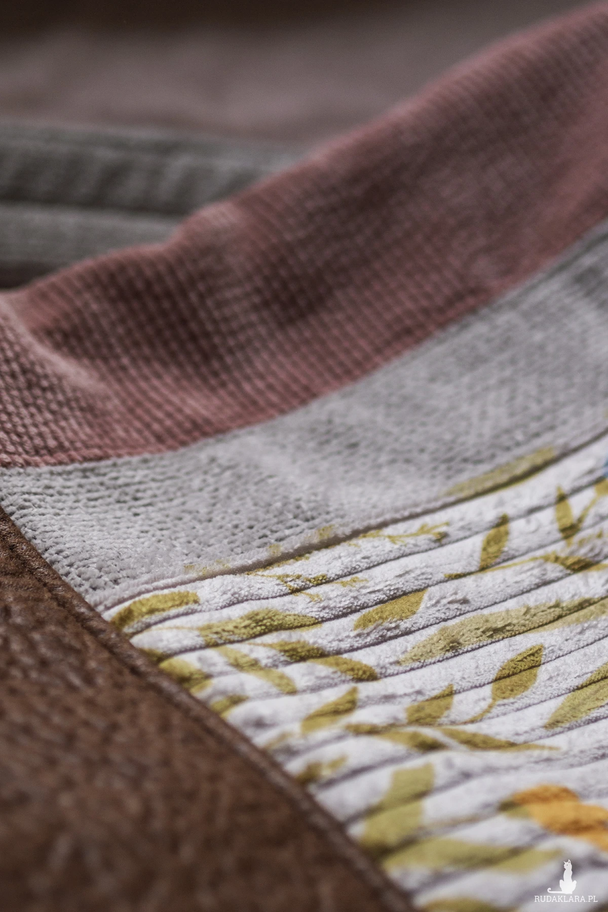 Duży, damski plecak miejski zapinany na suwak z kilku rodzajów kolorowych tkanin w połączeniu z brązową tłoczoną ekoskórą.