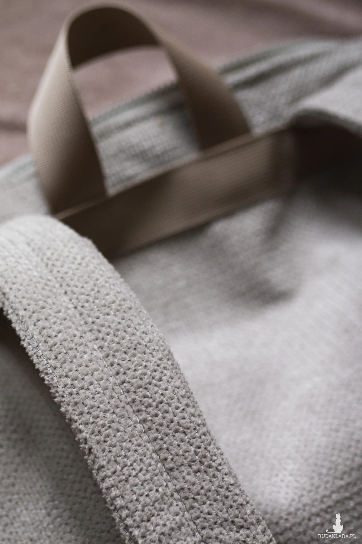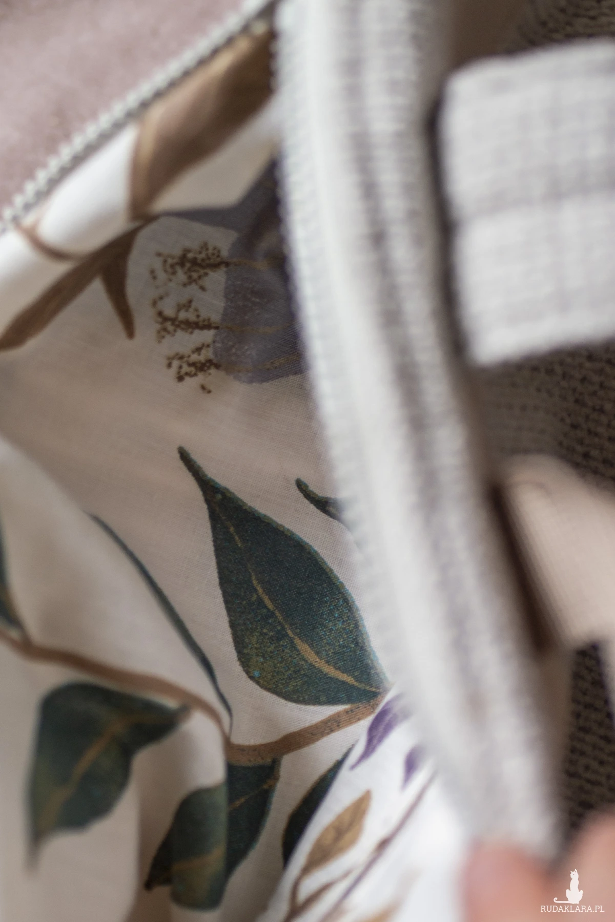 Regulowane paski. W środku kremowa, bawełniana podszewka w kwiaty oraz mała kieszonka na suwak.