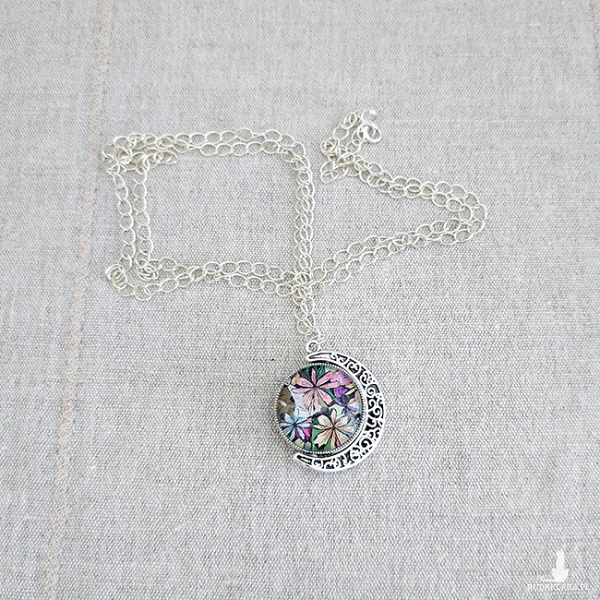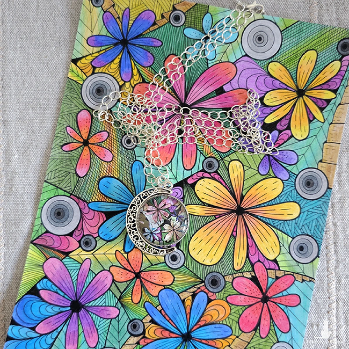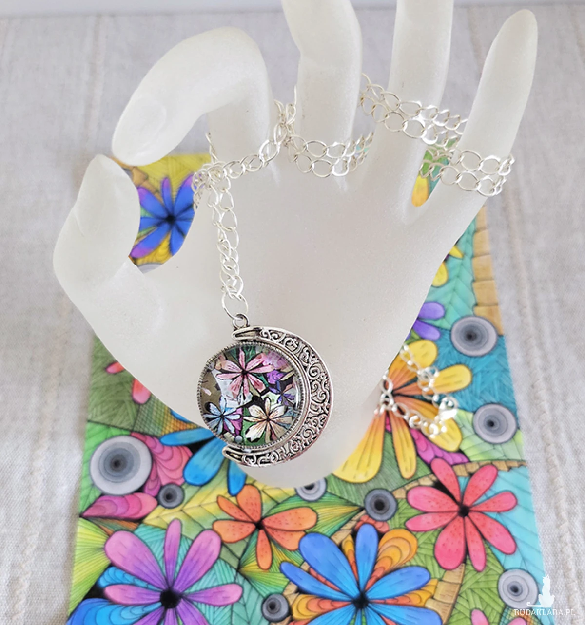 Naszyjnik z fragmentów rysunków mojego autorstwa ukrytych za szkłem w wisiorku.
