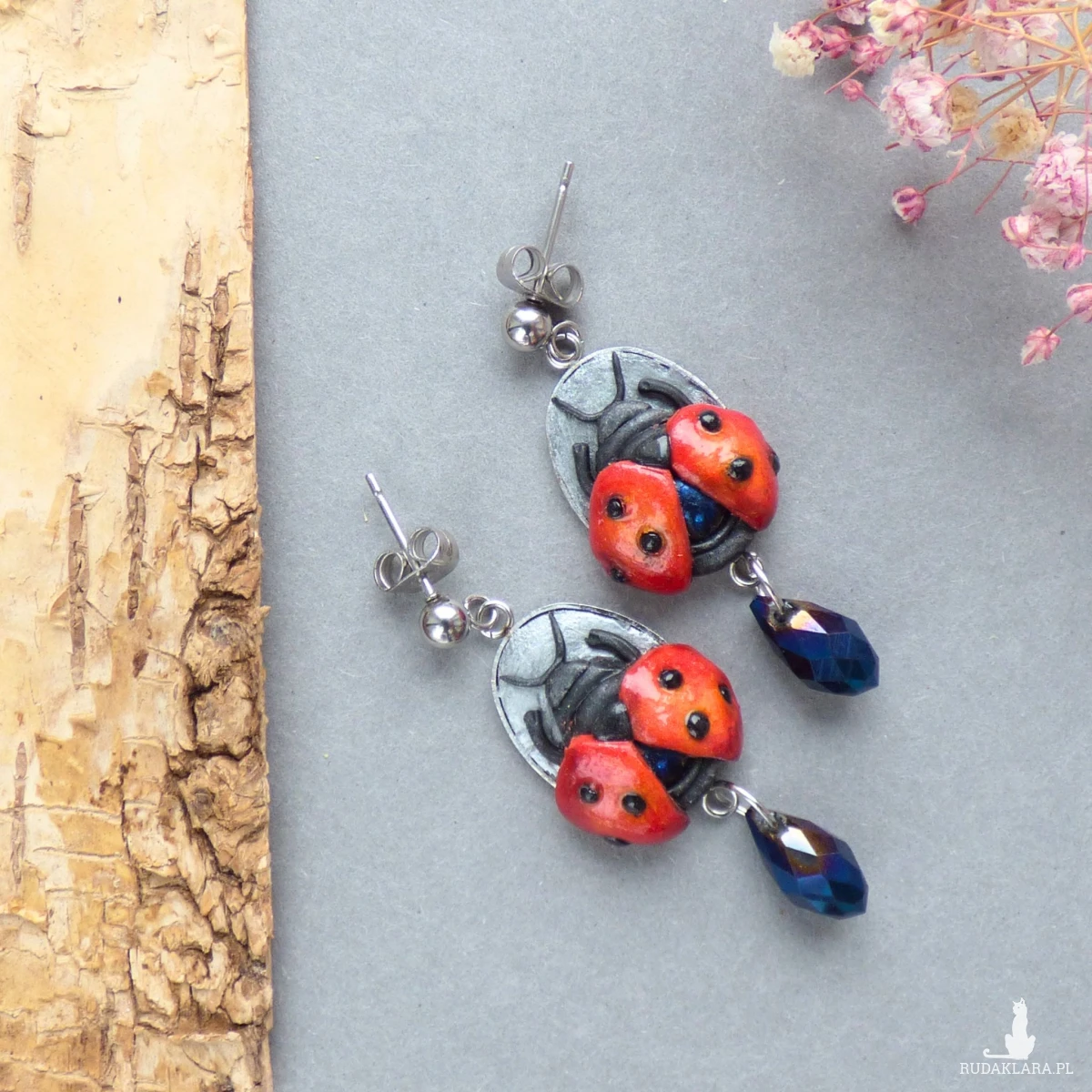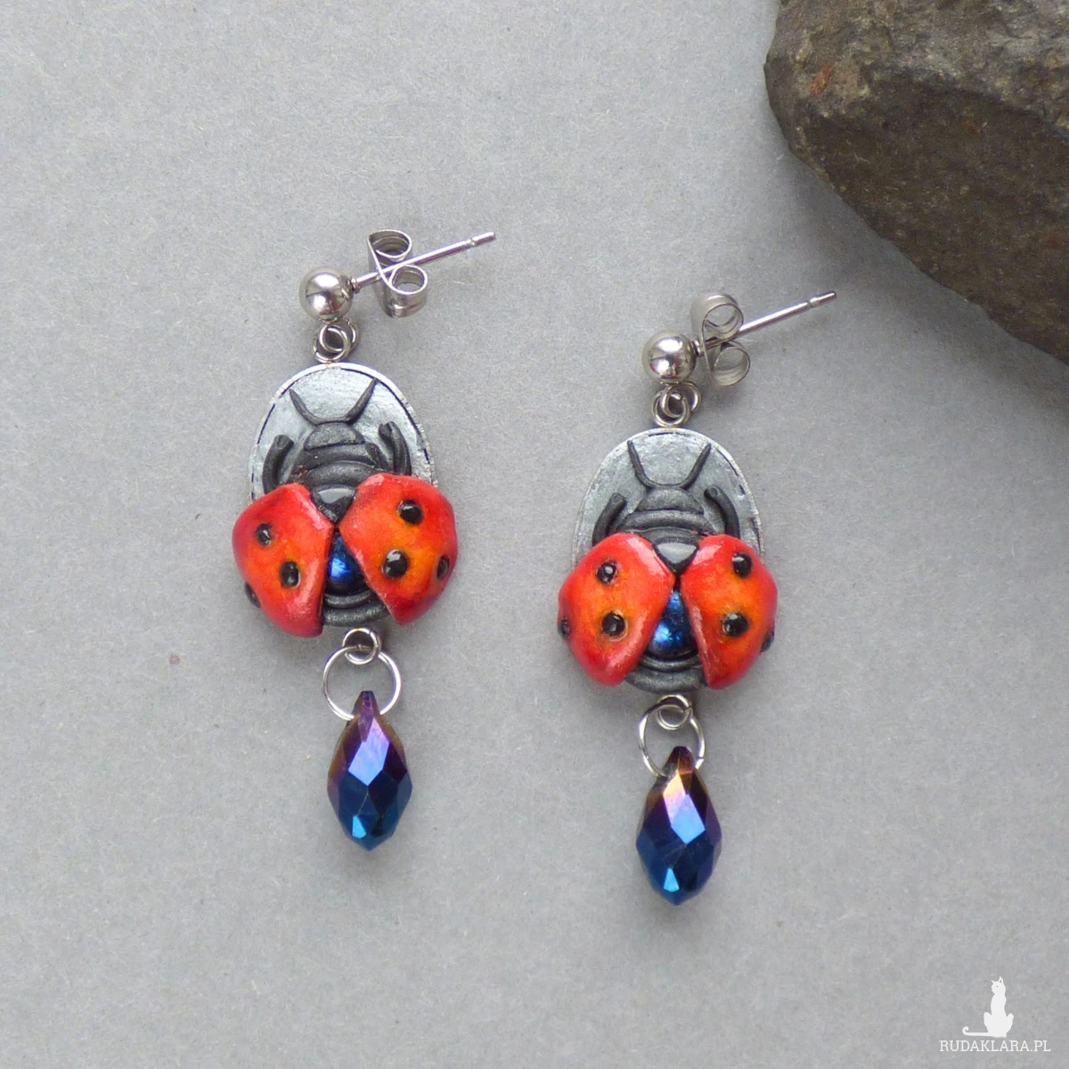 Kolczyki przedstawiające biedronkę w chwili rozkładania skrzydeł – uchwycone w locie, pełne energii i bajkowego uroku! Miniaturowa rzeźba wykonana ręcznie z glinki polimerowej pokazuje czerwone pokrywy skrzydeł i granatowy odwłok wykonany z połyskującego szklanego koralika.