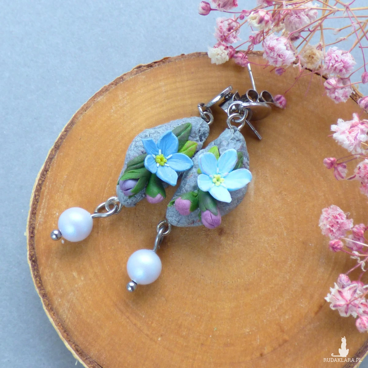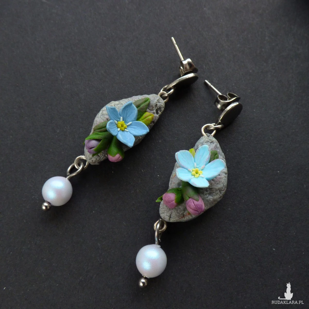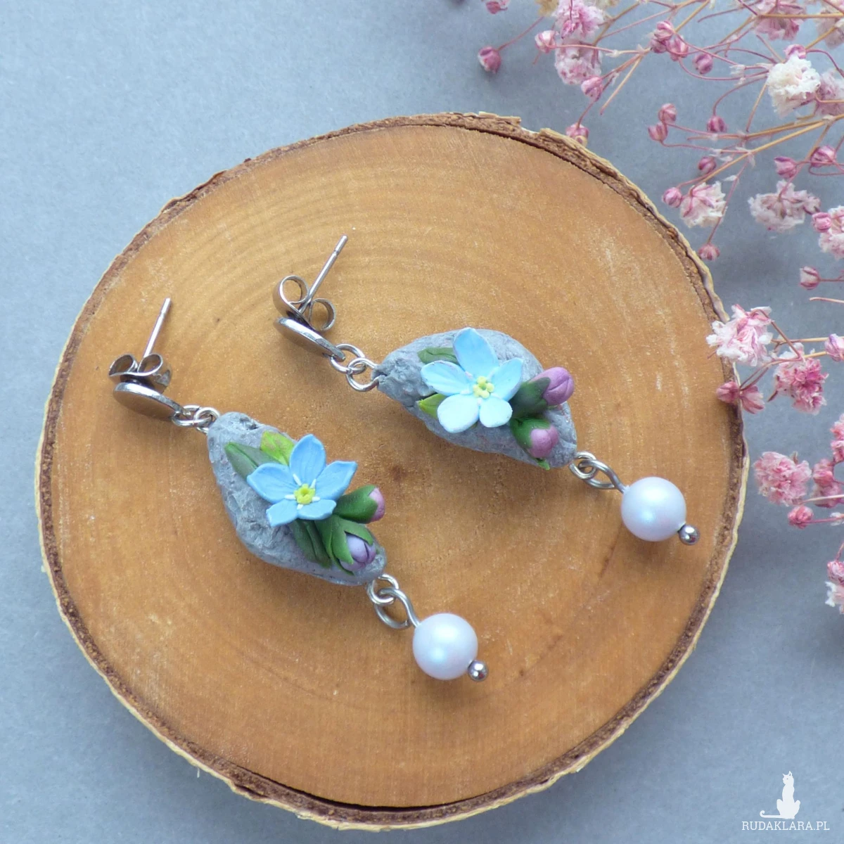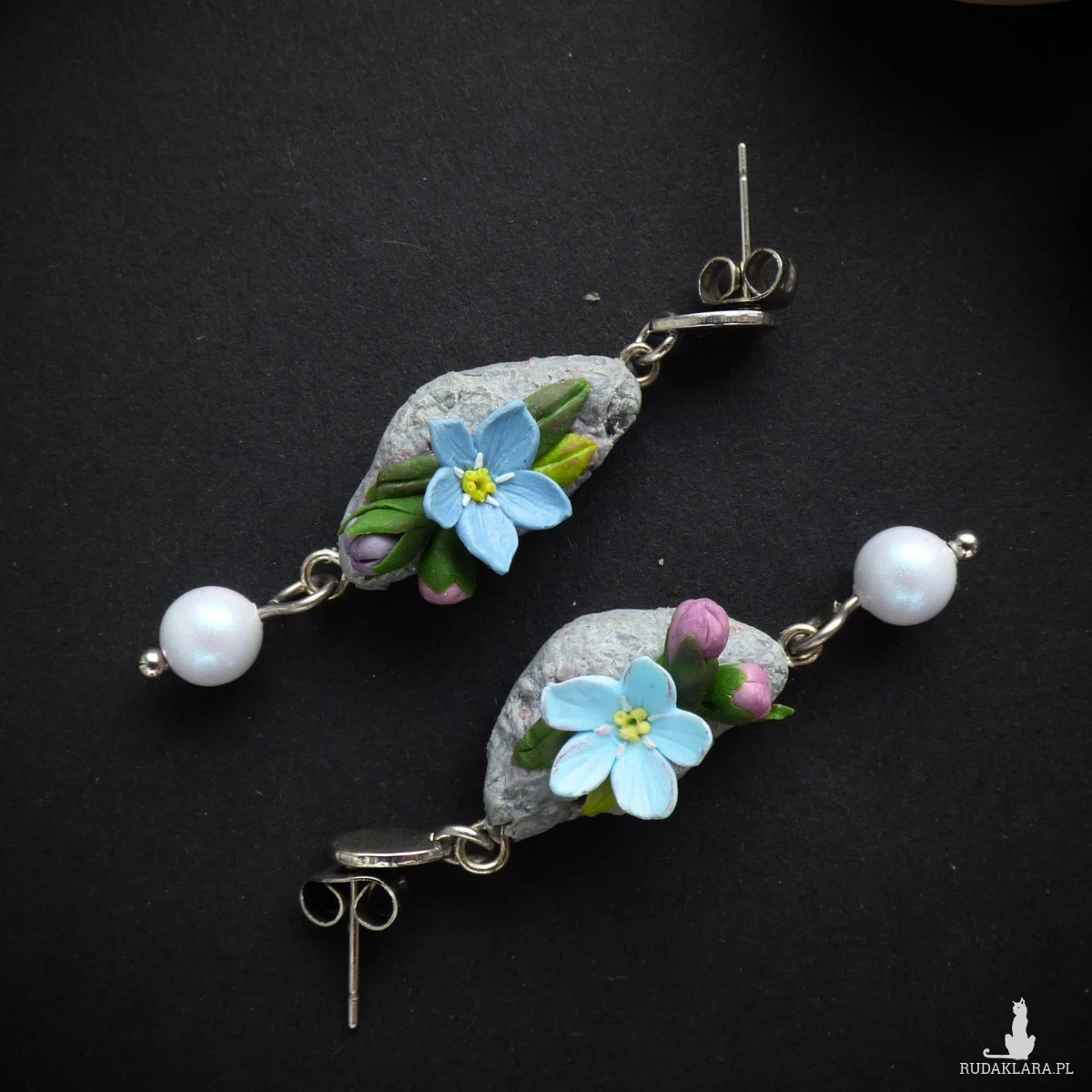 Subtelne, romantyczne kolczyki inspirowane naturą – delikatne niezapominajki wyrzeźbione ręcznie z glinki polimerowej zostały osadzone na „kamieniach”, tworząc miniaturowy ogród zaklęty w biżuterii. Każdy detal – od niebieskich płatków po pączki kwiatowe i liście – wykonany jest z niezwykłą precyzją.