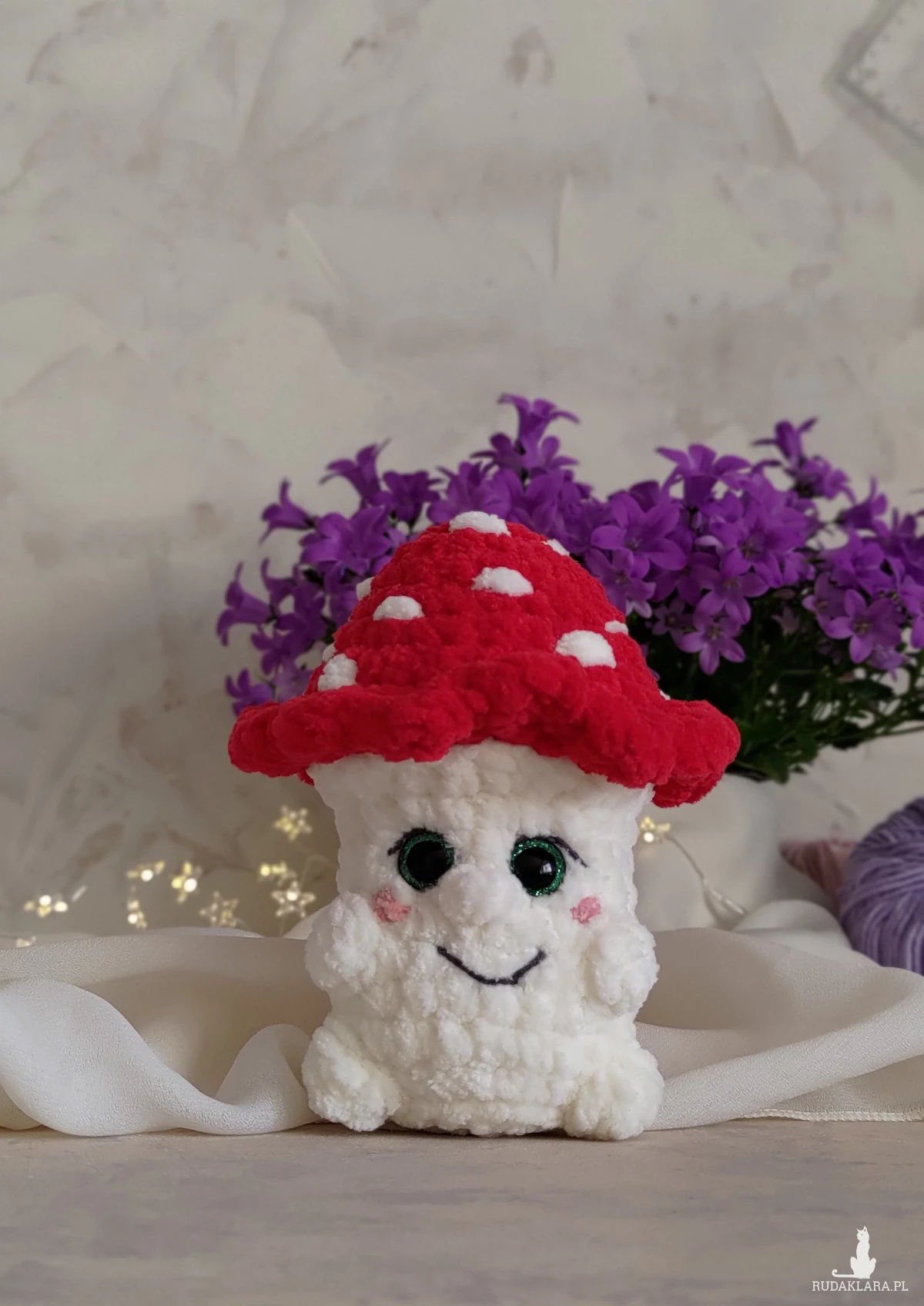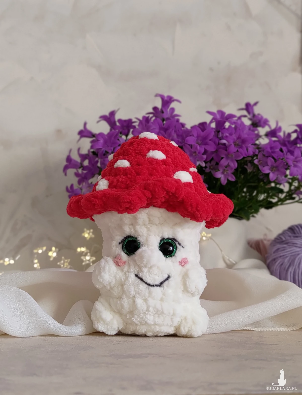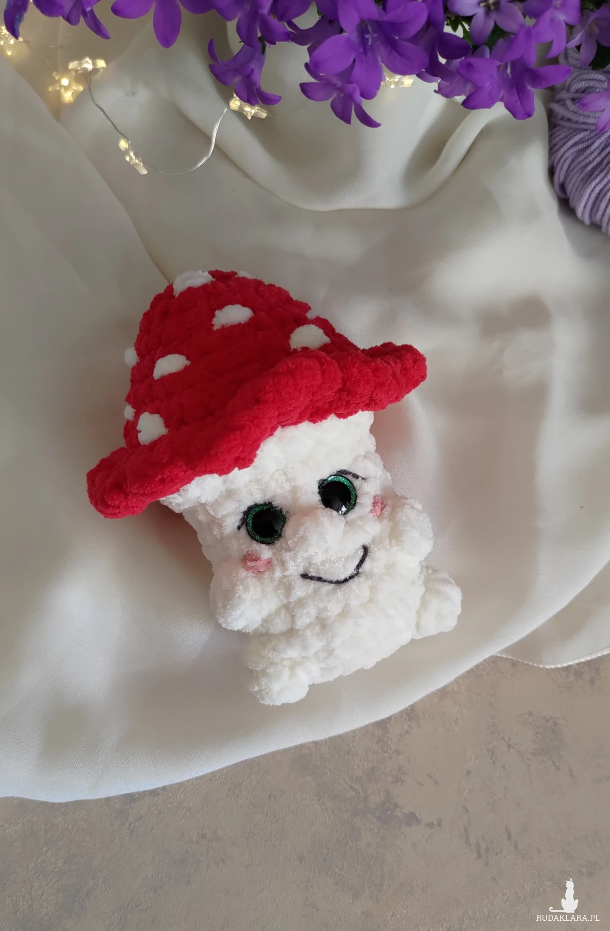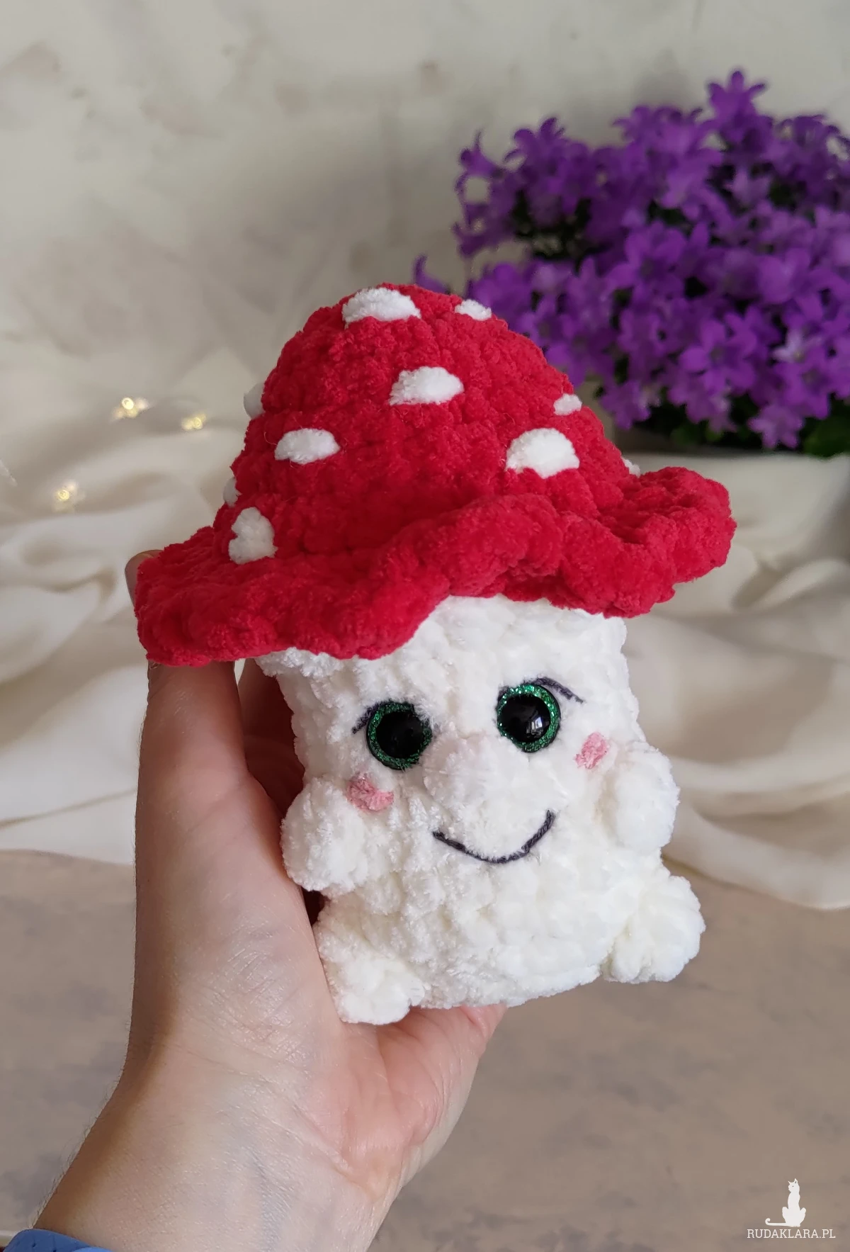 - Grzybek wykonany jest z pluszowej miękkiej włóczki i jest bardzo miękki w dotyku.