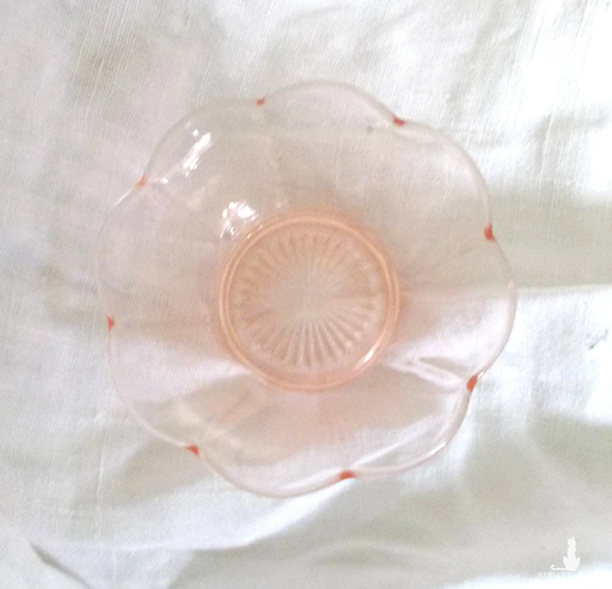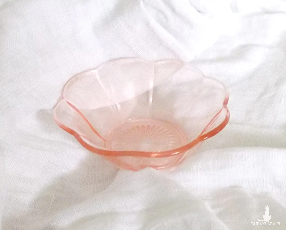 Vintage przedmiot z lat 70 lub 80 XX w. Średnica u góry ok. 10,5 cm u dołu 6 cm, szkło barwione w masie. Retro szklane naczynie na deser, cukierki, galaretkę, bakalie, słodycze, lody itp.