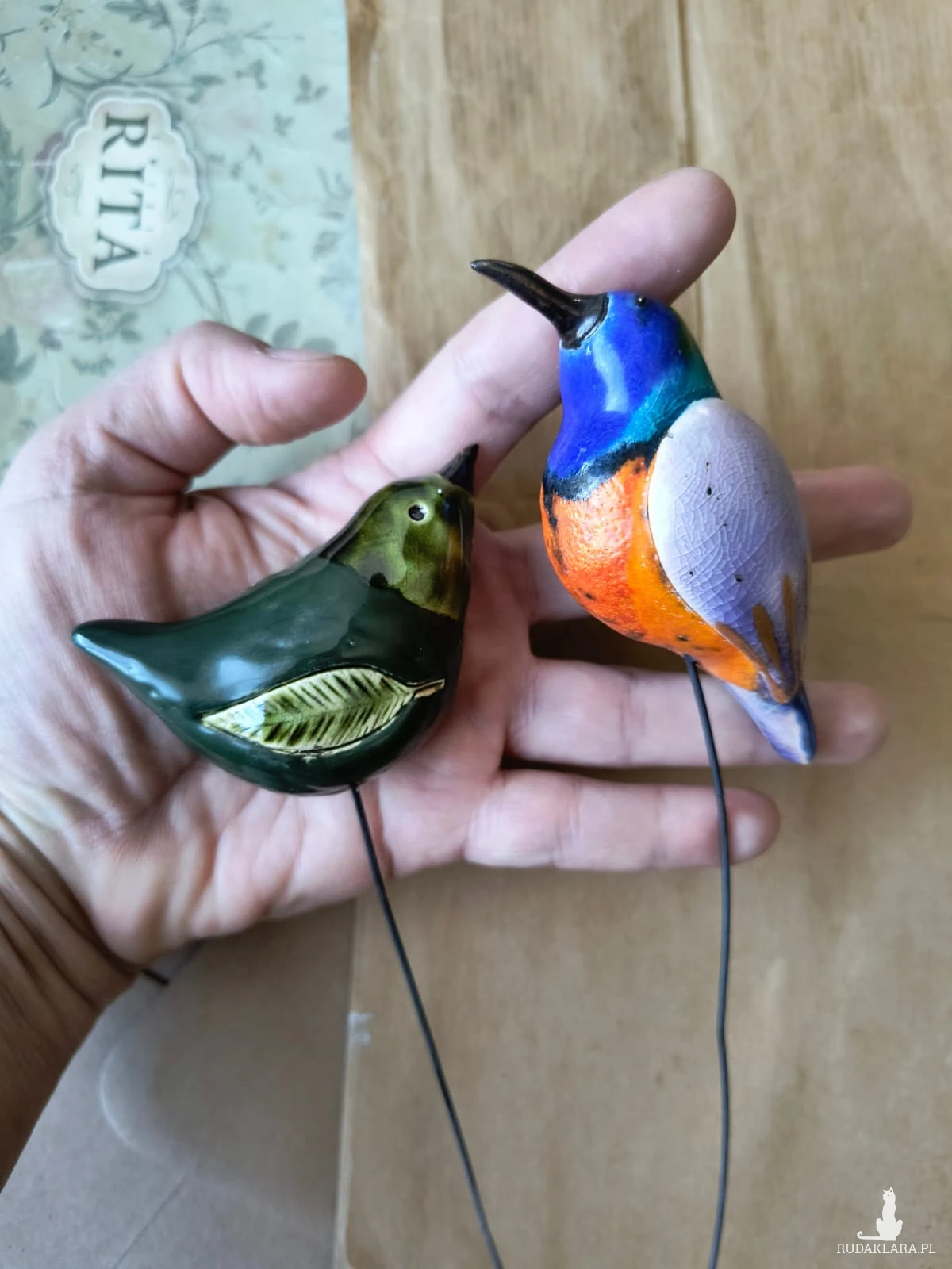 Siedzące ptaszki ceramiczne, wykonane z gliny szamotowej, wypalone na biskwit, a następnie szkliwione w temp. ok 1260 stopni C. Wymiary 6 cm x 5,5 cm. Na piku, świetnie sprawdzą się jako dodatek do doniczki.. Serdecznie polecam!!!