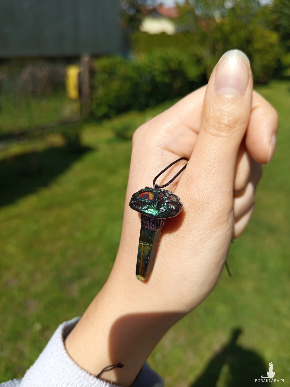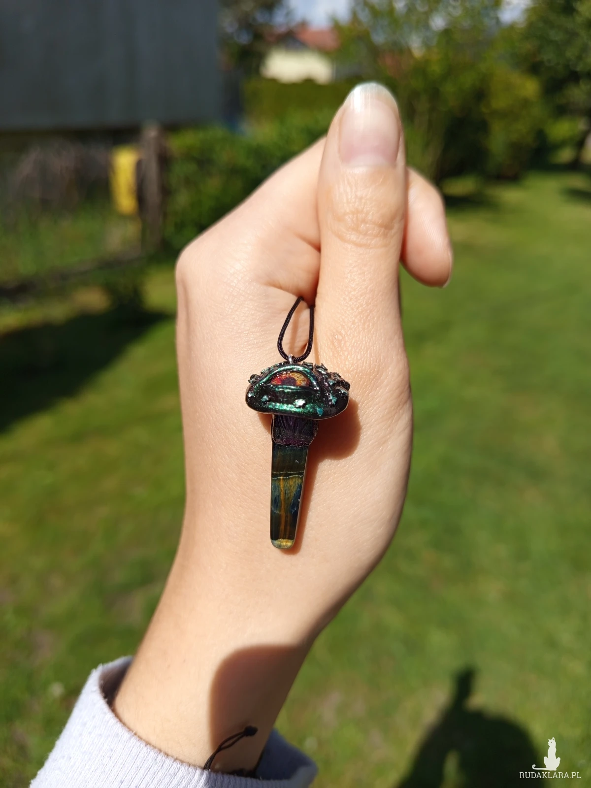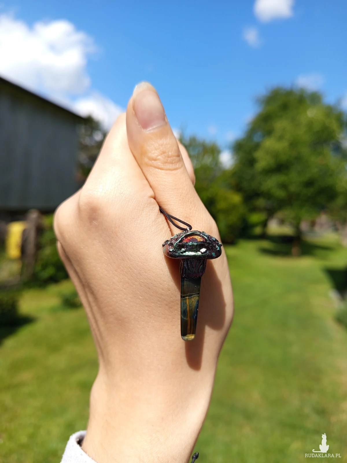 naszyjnik z masy polimerowej z tygrysim okiem, ręcznie rzeźbiony oraz malowany