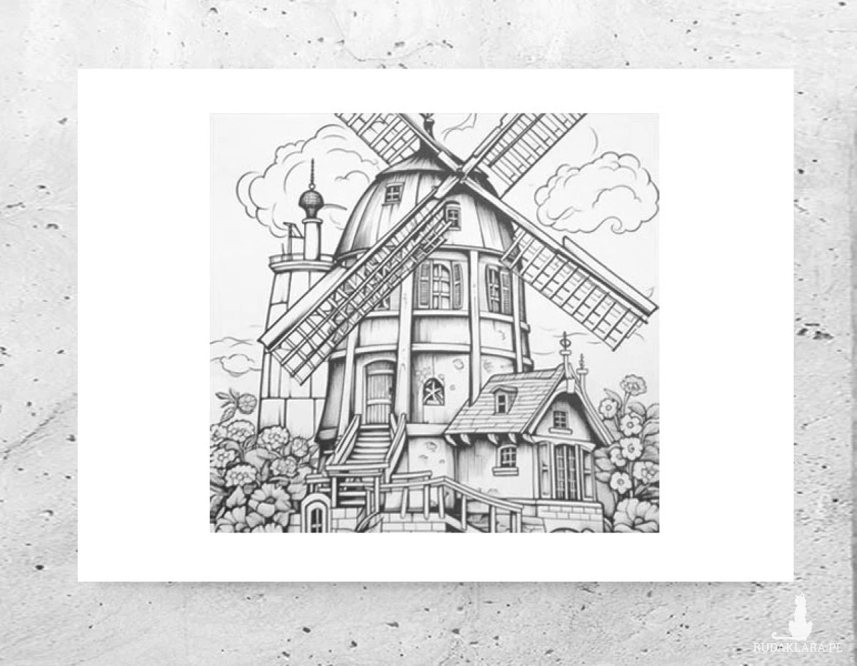 Nowy plakat z wiatrakiem, młynem w stylu retro. Biało czarna ilustracja na białym kartoniku A4. Poster wystarczy tylko umieścić w ramce 21 x 30 cm. Plakat na ścianę do biura, gabinetu, salonu, sypialni, przedpokoju, pokoju młodzieżowego, jadalni, kuchni, kawiarni, restauracji itp. Grafika będzie pasowała do wnętrz urządzonych w stylu boho, mieszanym, vintage, rustykalnym, tradycyjnym, prowansalskim, klasycznym, eklektycznym. Przedmiot do dekoracji wnętrz.