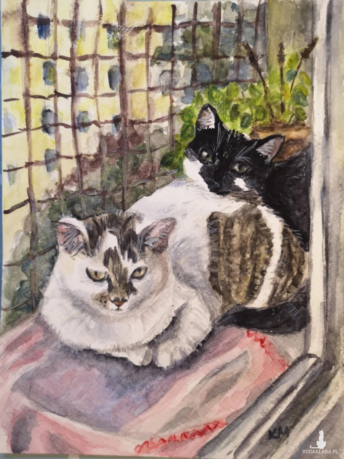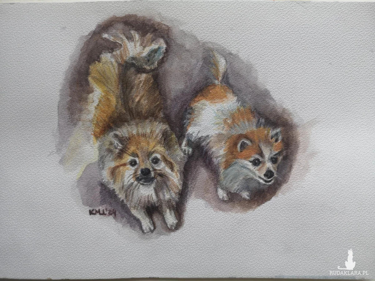 Wykonuję portrety zwierzaków na zamówienie. Maluję na papierze akwarelowym Gamma o gramaturze 200 i 300 farbami firmy Roman Szmal. Ważne jest dla mnie oddanie charakteru zwierzaka, bo uważam, że każdy nasz mały przyjaciel ma swoją niepowtarzalną osobowość. Szczególnie wzruszające jest dla mnie malowanie portretów pamiątkowych zwierząt, które przebywają za Tęczowym Mostem. Wiem jakie ważne są dla zamawiających i obdarowywanych. Sama jestem ludzką mamą dwóch wyjątkowych kotów - Stasi i Józka (mamy i synka), adoptowanych z jednej z krakowskich fundacji. Ich portrety można zobaczyć także w mojej galerii.