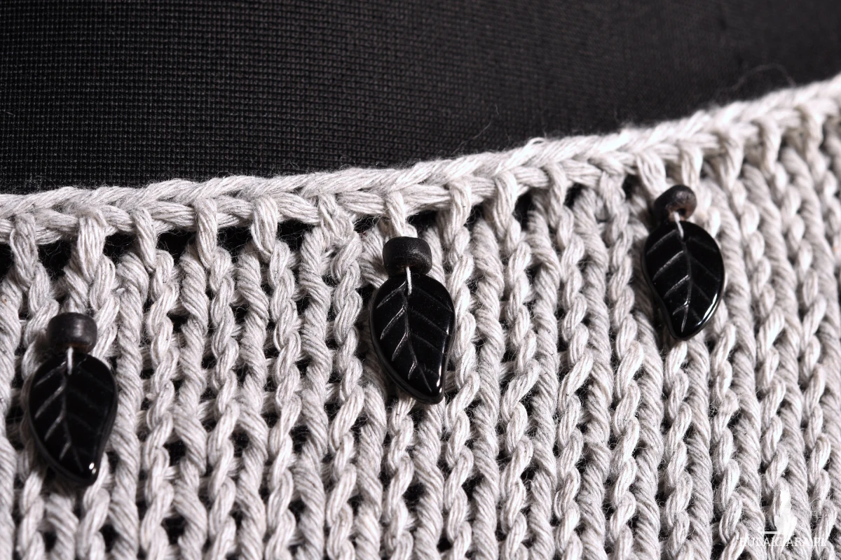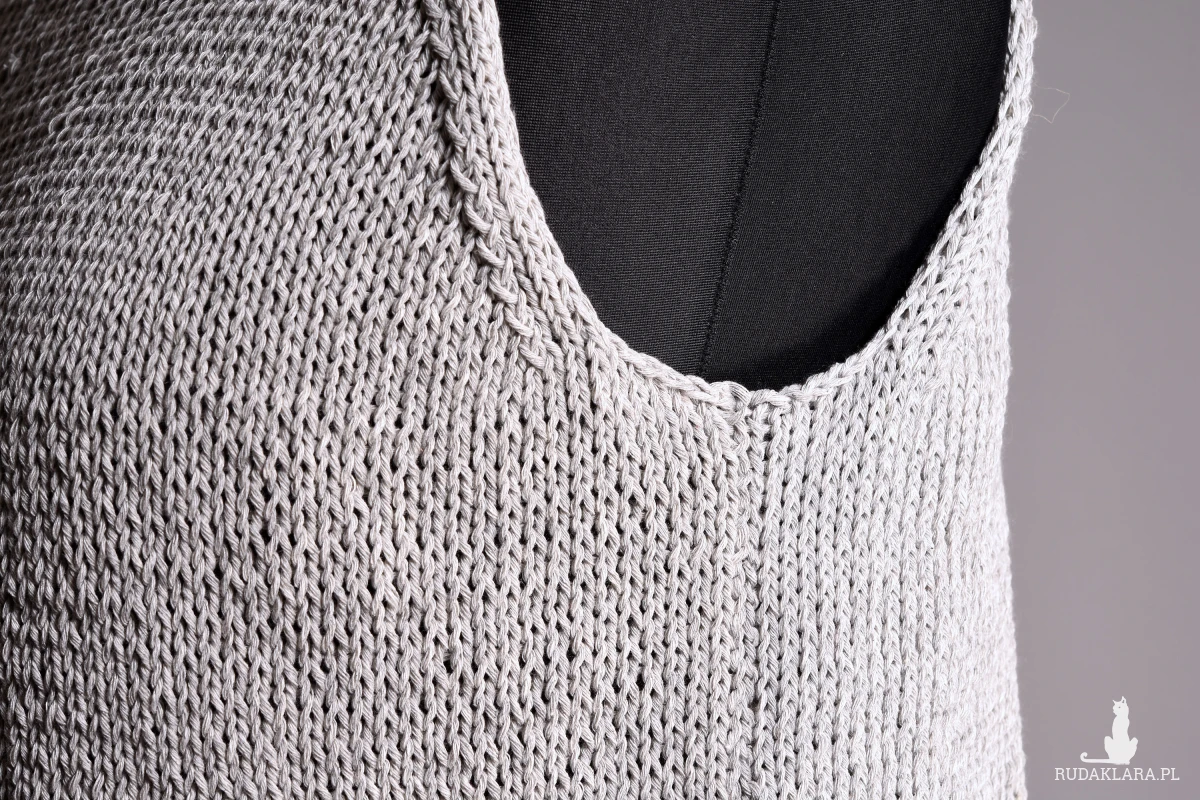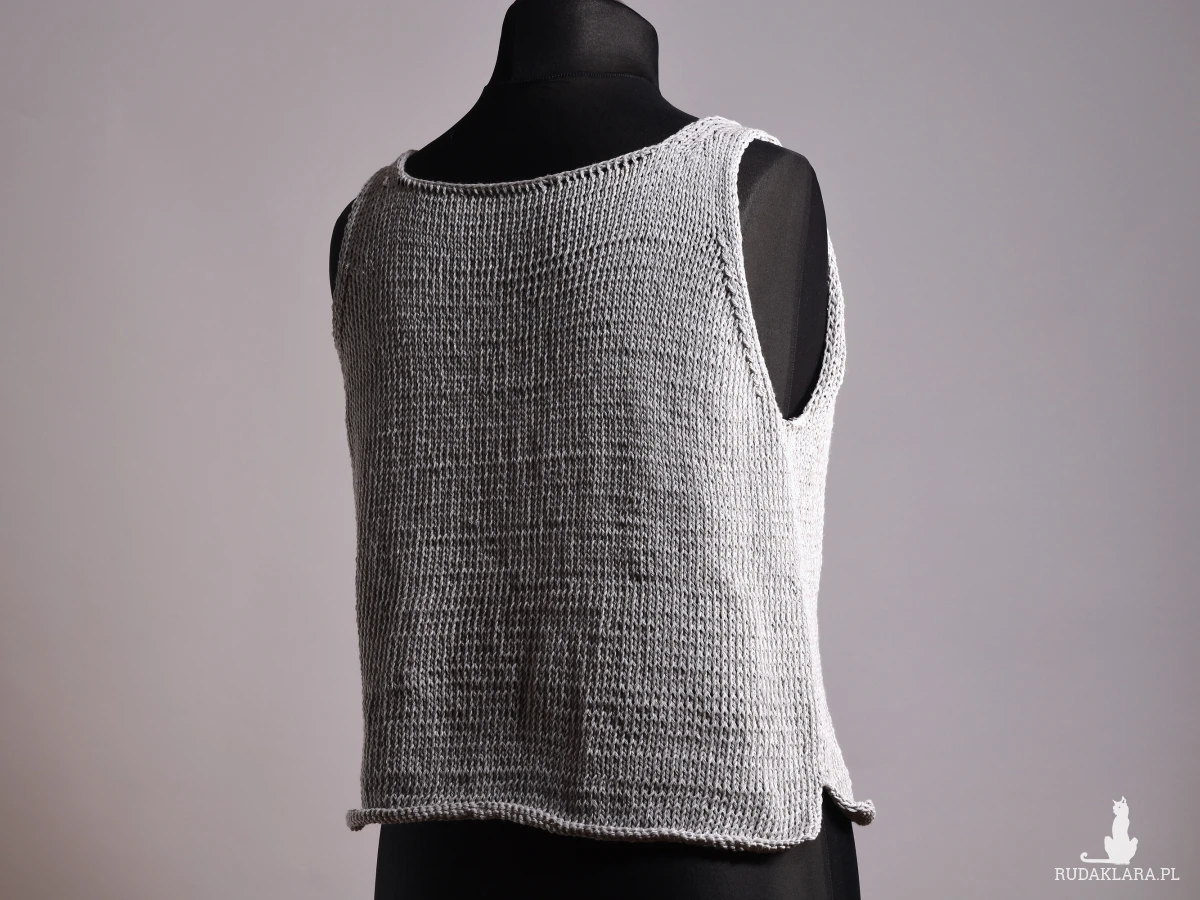 Top zrobiony ręcznie, zrobiony na drutach. Bluzka na ramiączkach z dekoltem w „łódkę”. Dodatkowym elementem dekoracyjnym są doszyte tuż pod dekoltem szklane korale w kształcie liści. Dolna część bluzki wykończona podwijającym się brzegiem. Prosta i elegancka bluzka na sezon letni. Top jest zrobiony z włóczki bawełnianej, lekkiej i przyjemnej dla skóry.
