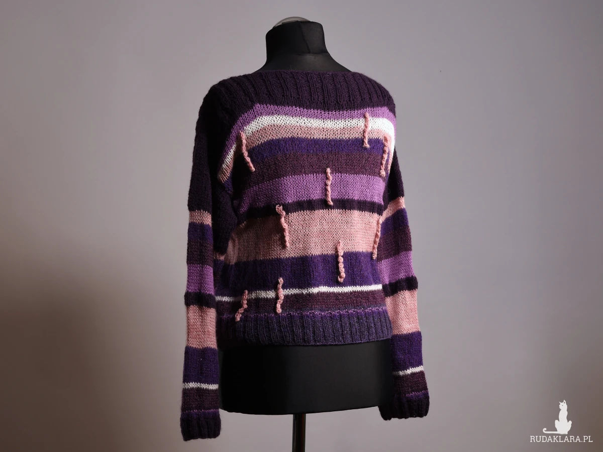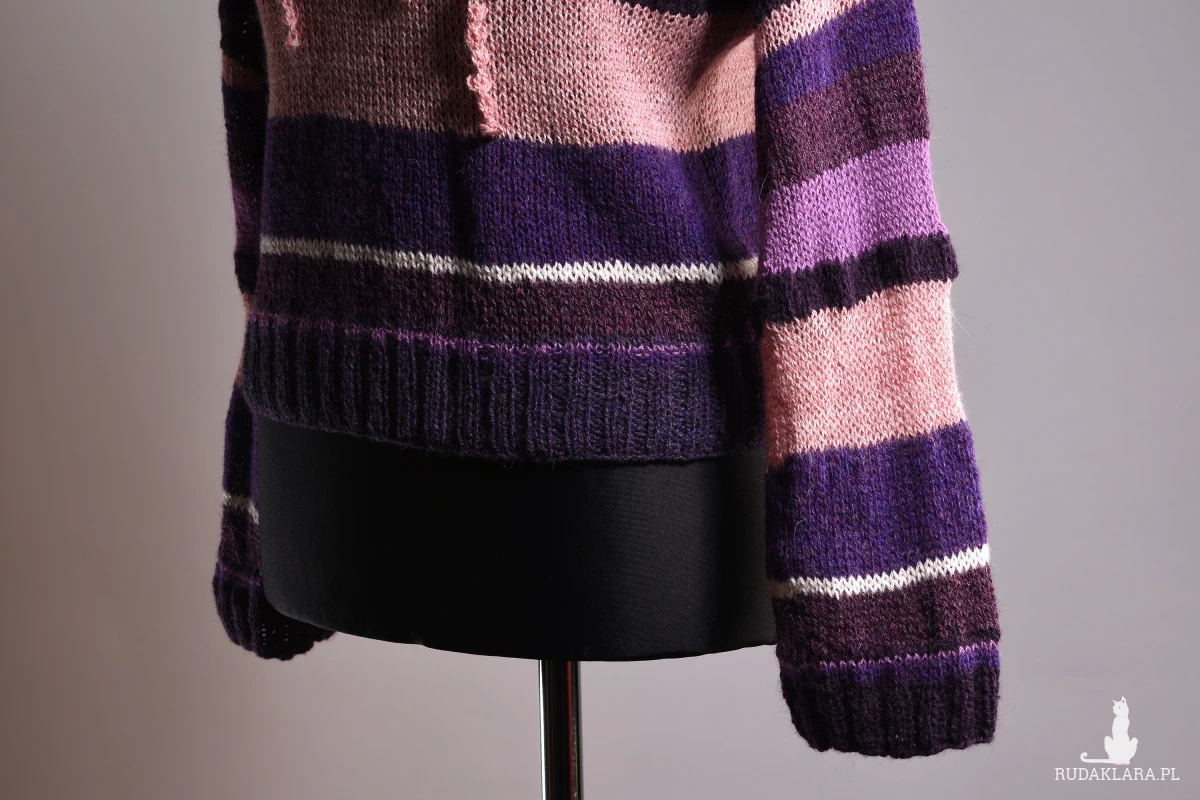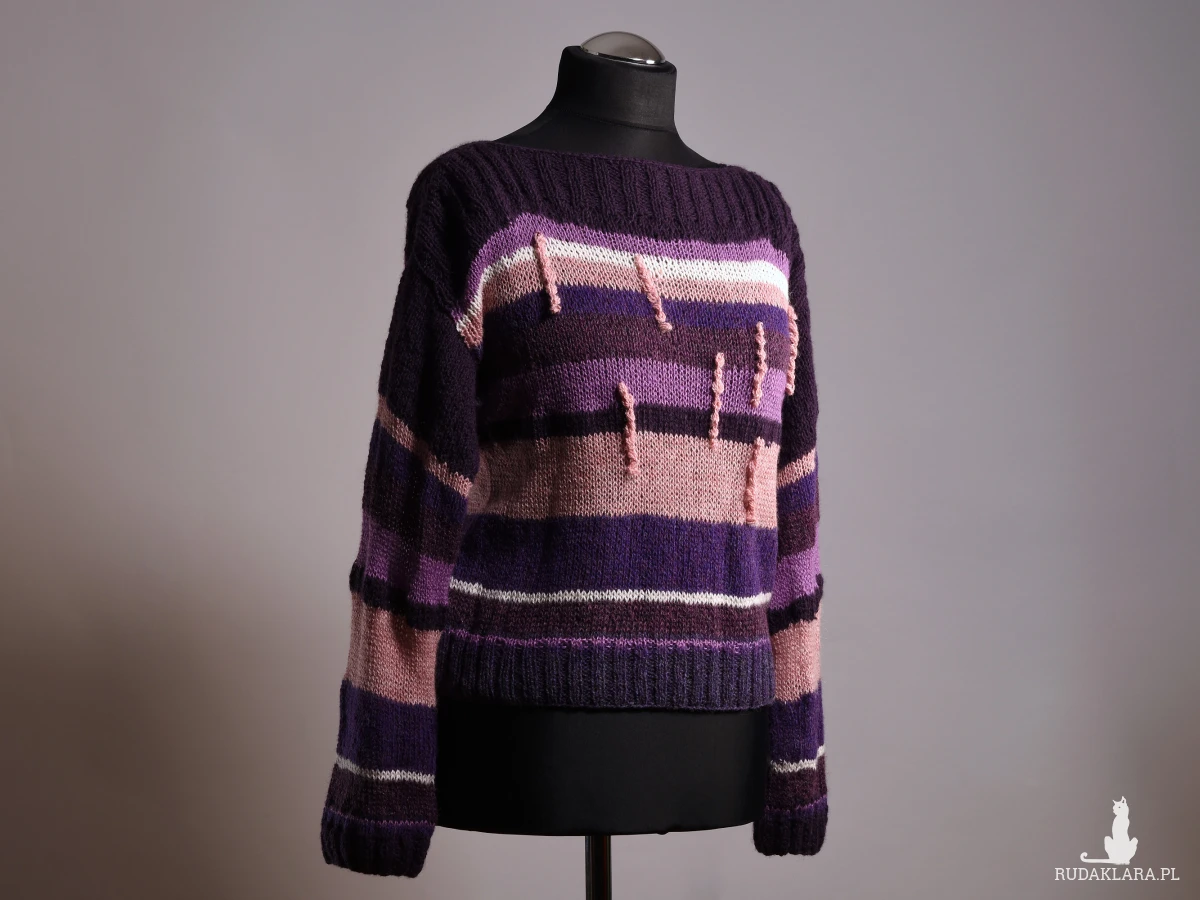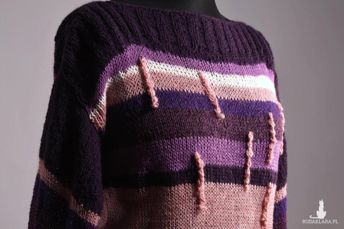 Sweter damski z alpaki. Zrobiony ręcznie, zrobiony na nieco grubszych drutach. Kolorowe pasy o różnej szerokości. Dekolt w „łódkę” i rękawy celowo zbyt długie (opadają na dłonie). Sweter zrobiony jerseyem i wykończony ściągaczami. Dodatkowo wyróżniające różowe aplikacje.