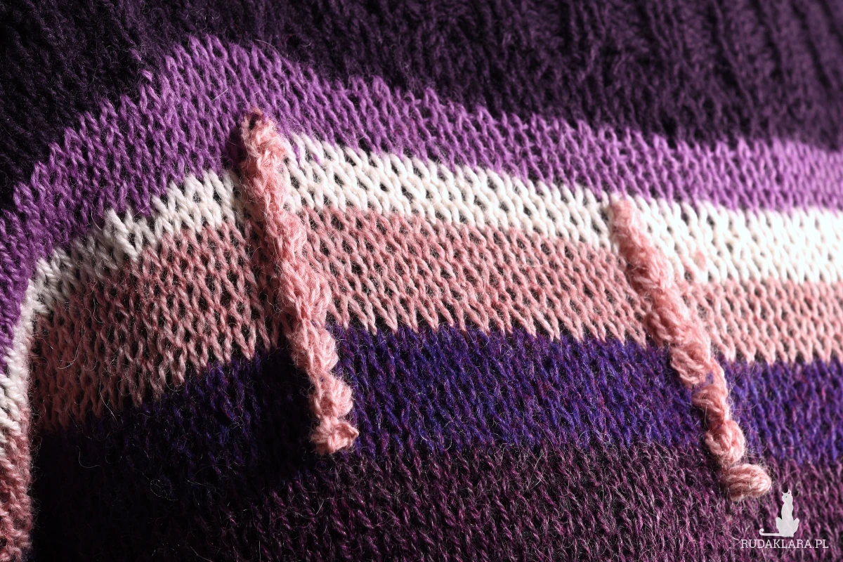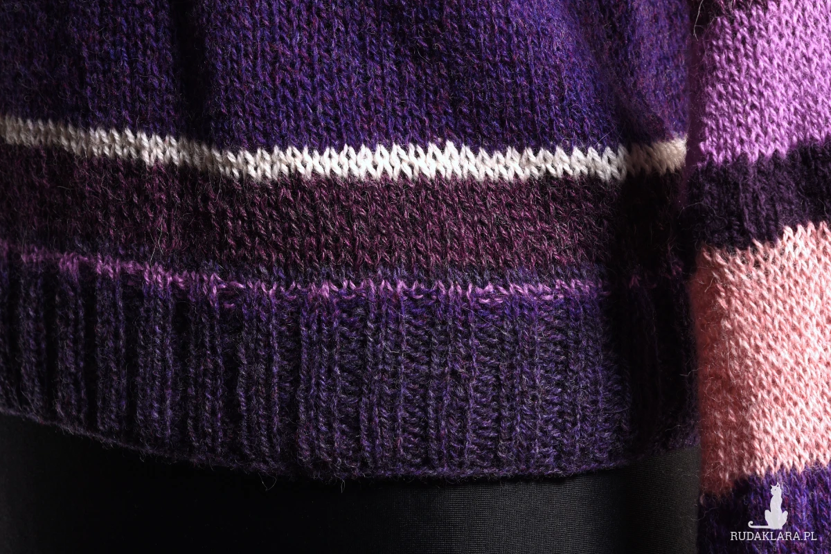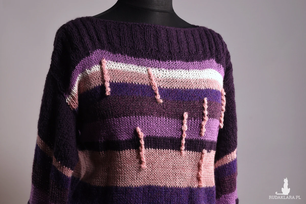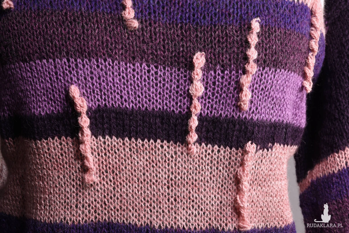 Sweter damski z alpaki. Zrobiony ręcznie, zrobiony na nieco grubszych drutach. Kolorowe pasy o różnej szerokości. Dekolt w „łódkę” i rękawy celowo zbyt długie (opadają na dłonie). Sweter zrobiony jerseyem i wykończony ściągaczami. Dodatkowo wyróżniające różowe aplikacje.