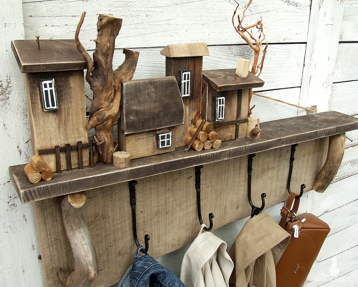 Drewniany duży wieszak z domkami i mocnymi haczykami na ubrania, które utrzymają ciężkie zimowe kurtki i płaszcze.