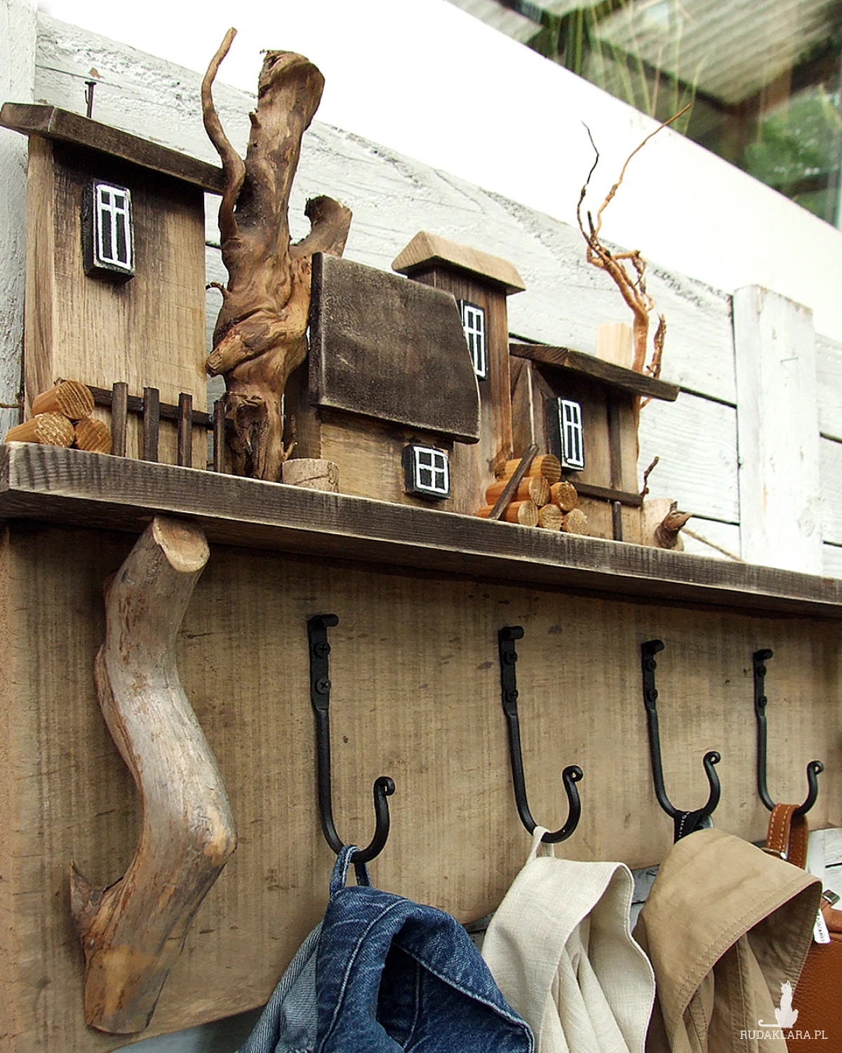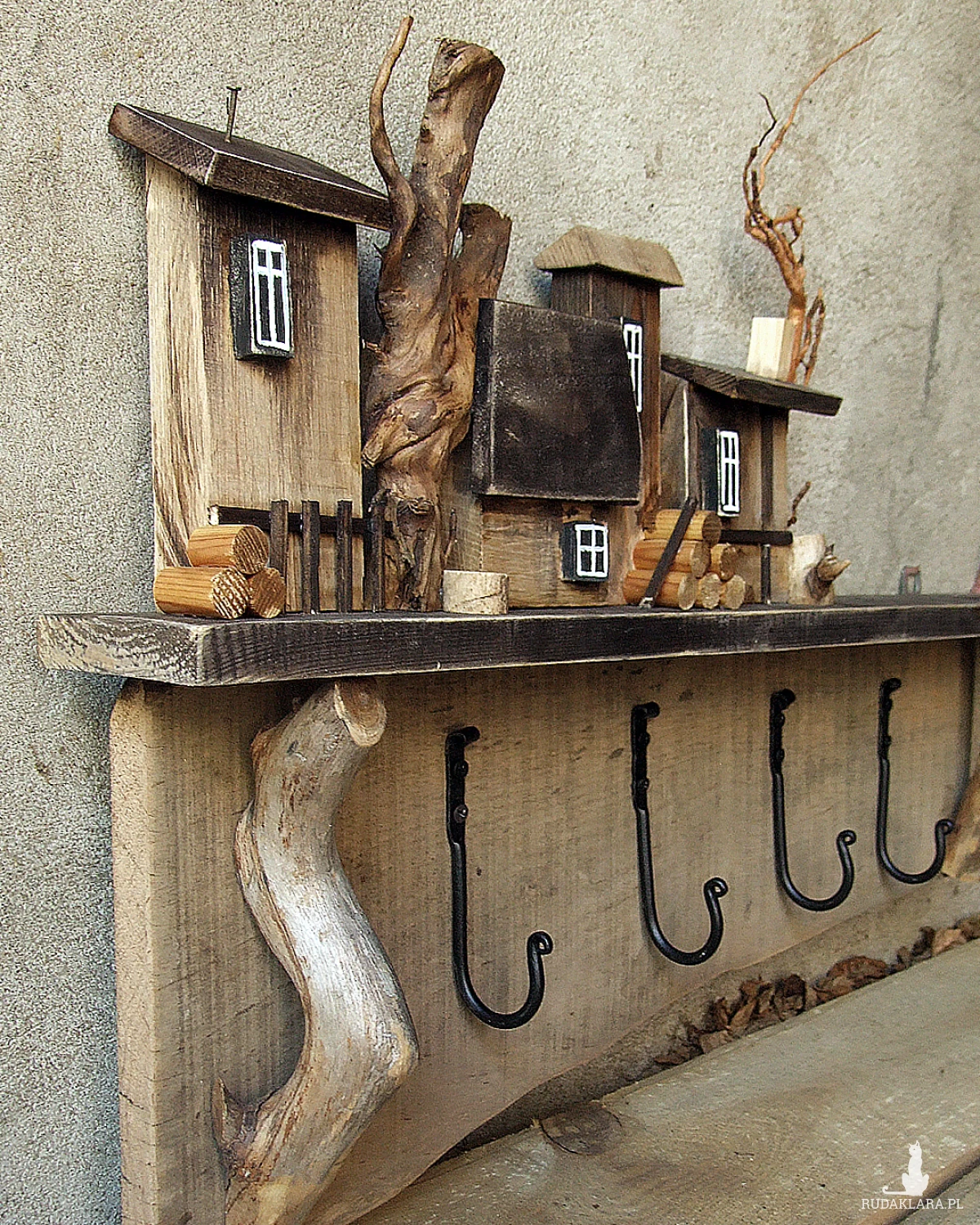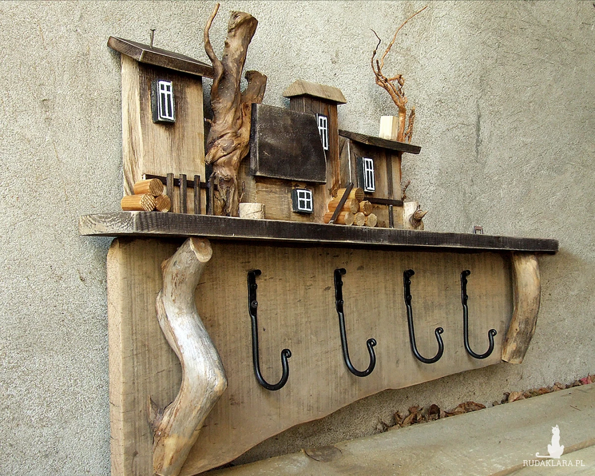 Do budowy tego wieszaka wykorzystaliśmy starą sosnową deskę o nierównej szerokości i ładnym nieregularnym brzegu. Dodatkowe elementy to naturalne gałązki, kóre imitują drzewa i które posłużyłe jako wsporniki pod półeczkę, na której stoi drewniana osada.