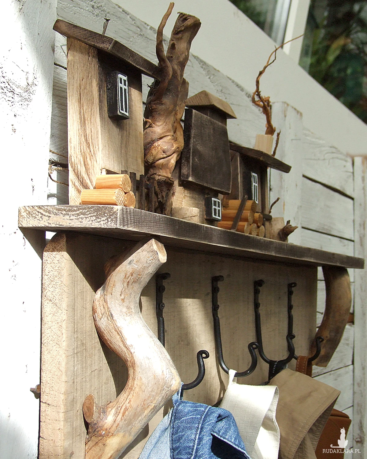 Pod domkami wieszak ma zamontowane cztery bardzo pojemne i wytrzymałe, czarne haczyki. Haczyki to rękodzieło z polskiej rzemieślniczej manufaktury.