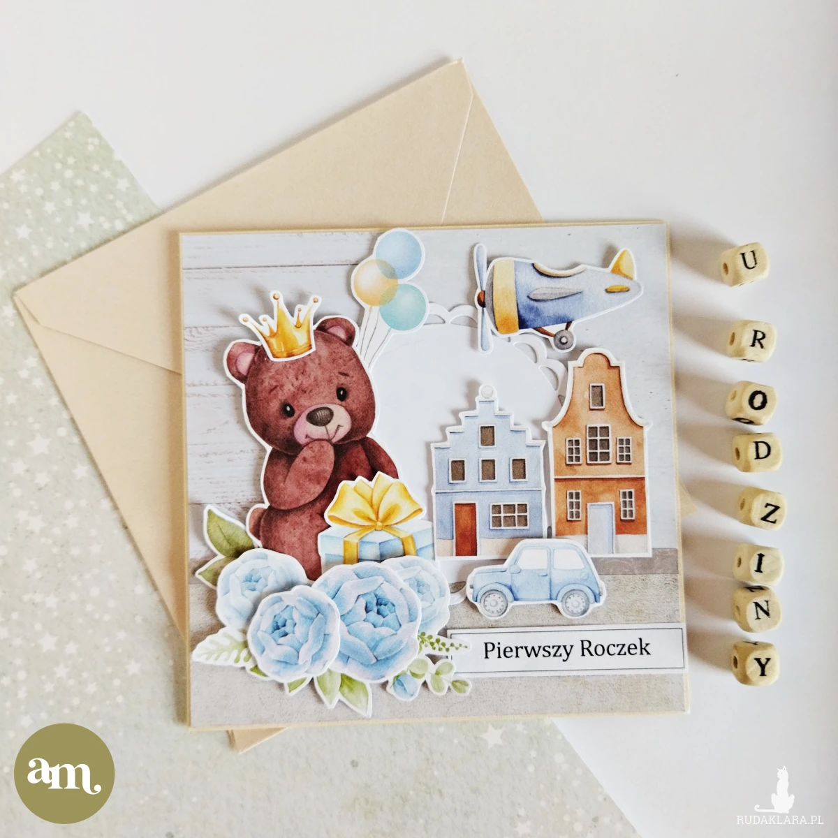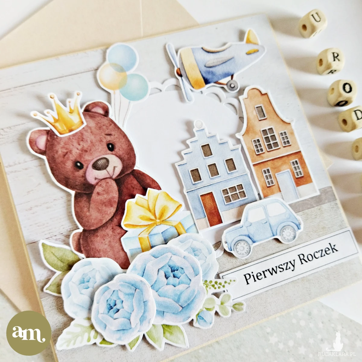 Przedstawiam Wam przeuroczą kartkę z motywem misia w koronie w otoczeniu ślicznych elementów dziecięcych oraz kwiatów.