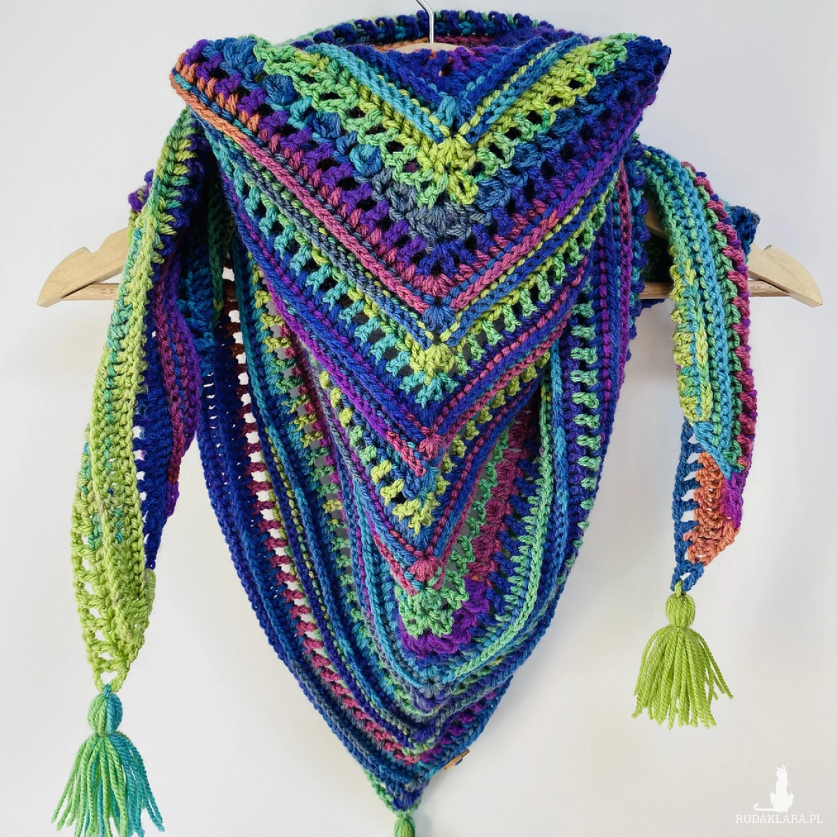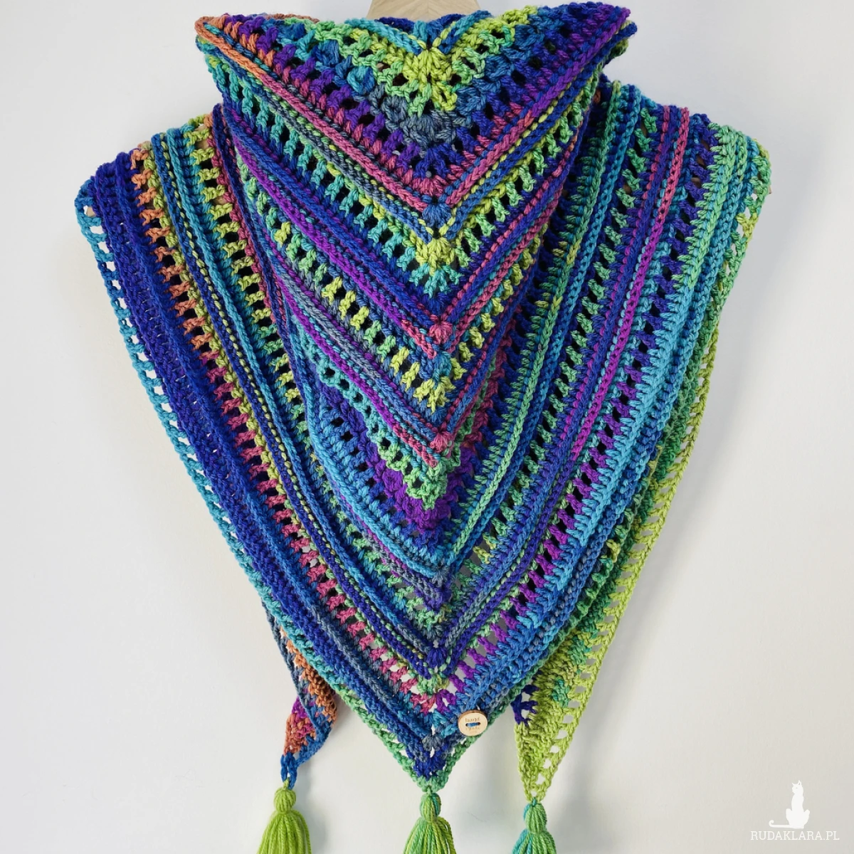 Chustę wykonałam na szydełku z miękkiej włóczki akrylowej, która zachwyca intensywnością koloru i delikatnością. Certyfikat OEKO-TEX® Standard 100 potwierdza, że jest bezpieczna dla a zdrowia materiały użyte do jej produkcji są wolne od szkodliwych substancji chemicznych.