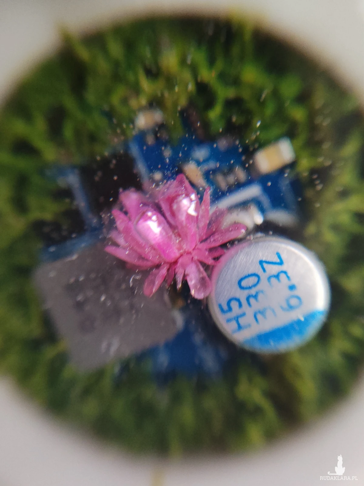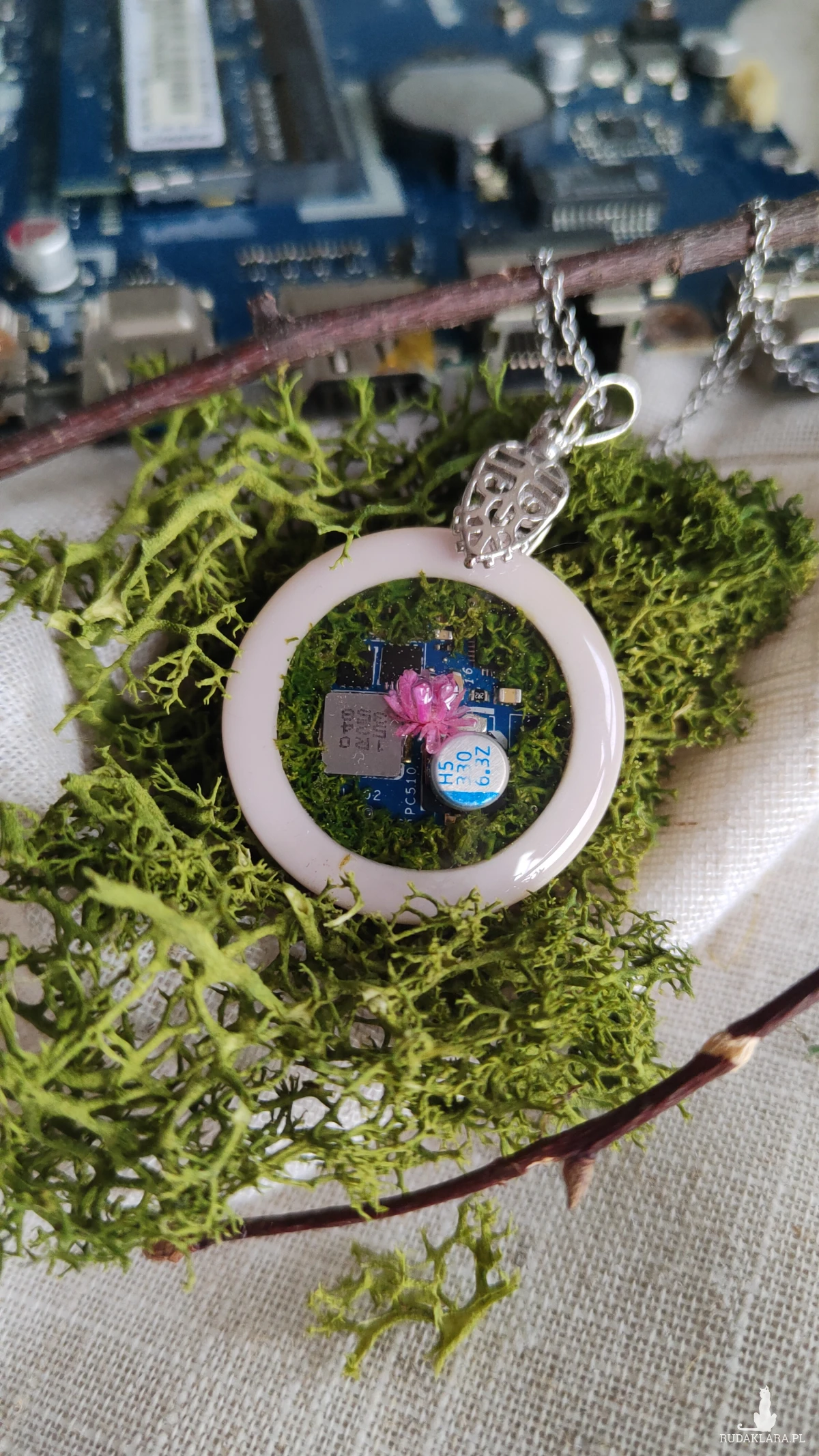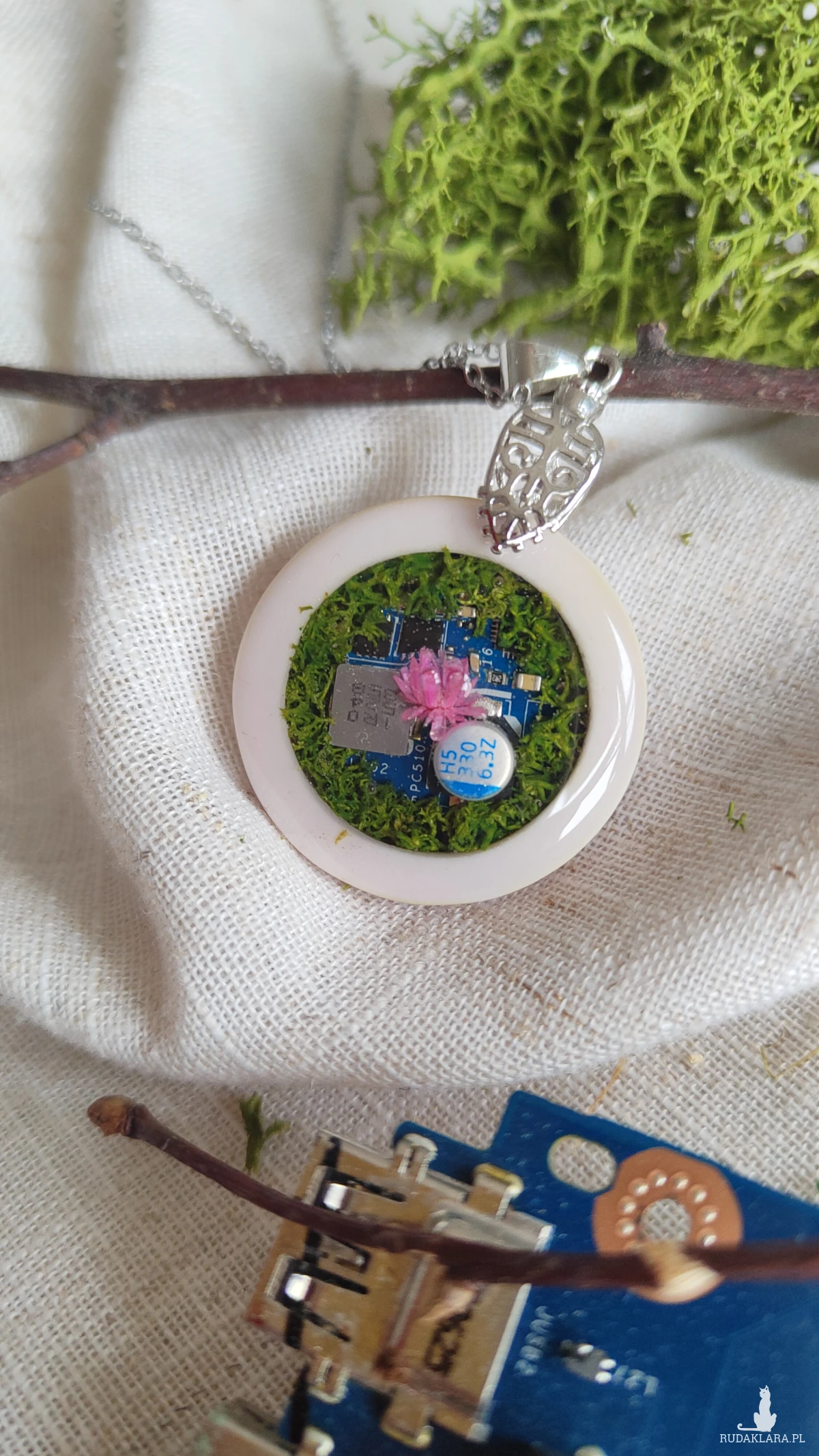 Materiały: żywica epoksydowa, sztuczny mech, suszony kwiat, recyklingowana płytka PCB
