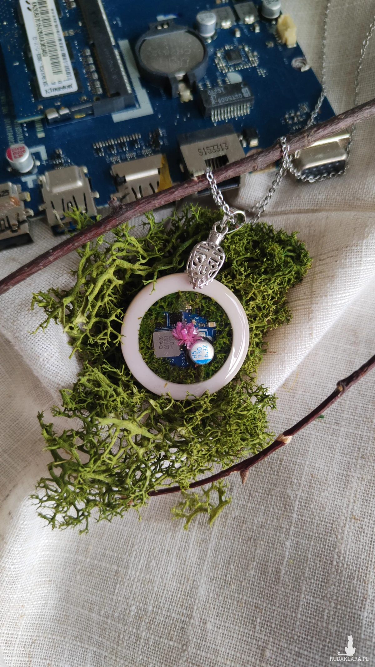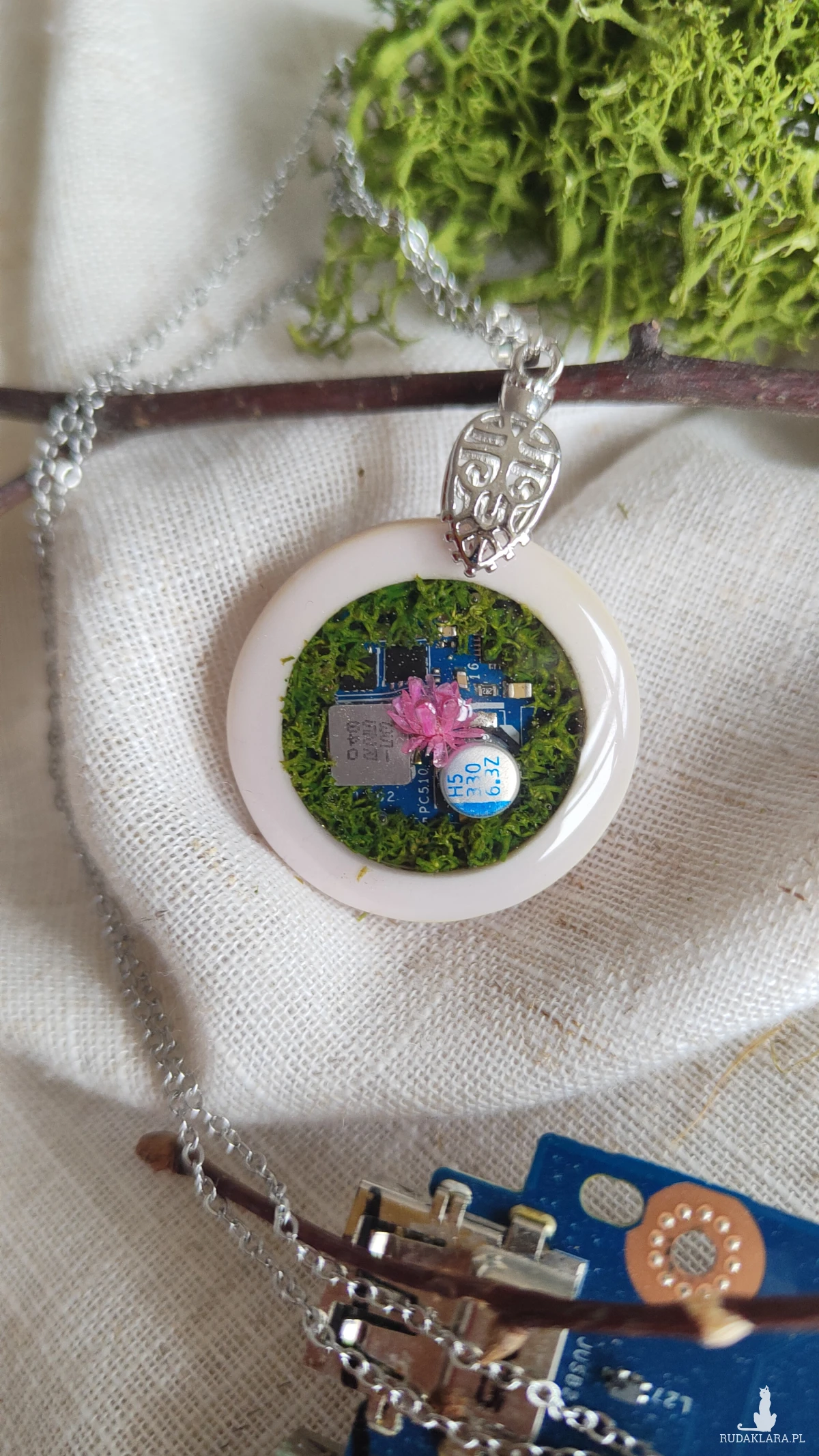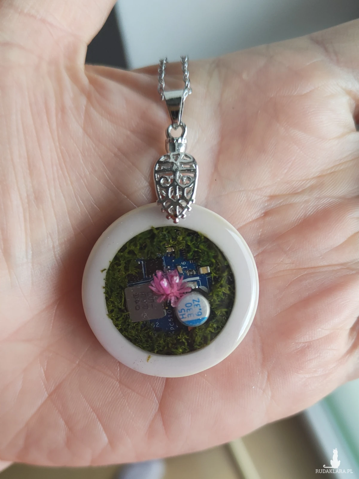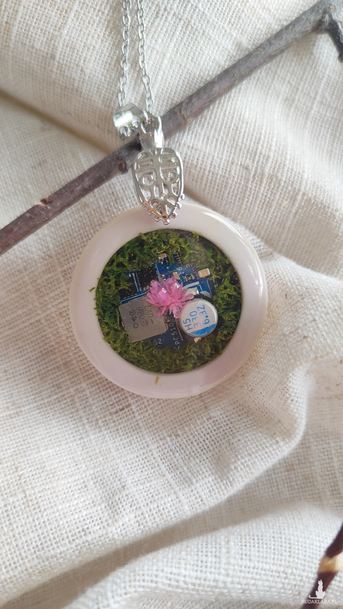 Połącz naturę i technologię w wyjątkowym naszyjniku! Ten ręcznie robiony, okrągły wisiorek z żywicy zawiera prawdziwy suszony kwiat, intensywnie zielony sztuczny mech oraz odzyskaną płytkę z komputera — wszystko zamknięte pod błyszczącą kopułą z perłowobiałą ramką.